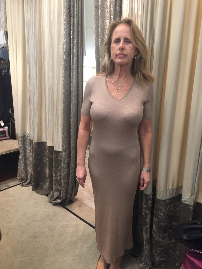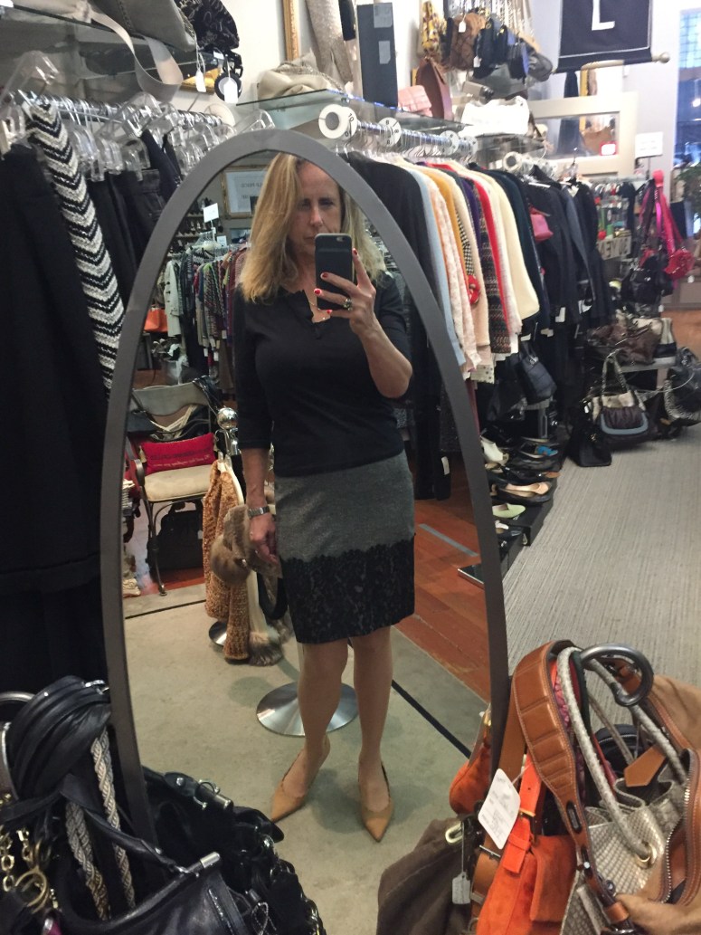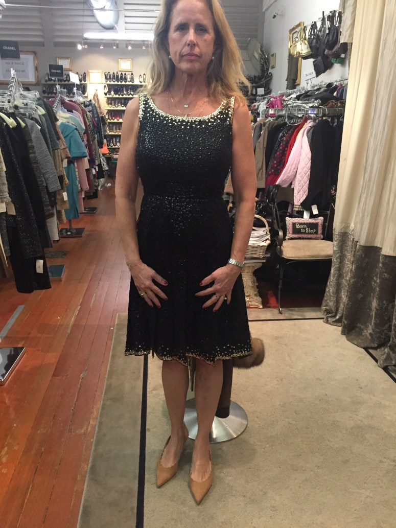 Saturday afternoon I spent a few hours at Clothes Heaven trying on clothes. I wasn’t alone, another customer was there and we chatted about clothes, life as we debated the merits of the beautiful pieces around us. Before I entered the store, though, I saw a beautiful long gold shiny Chanel dress in the window — it was my size so I had to try it on. And it was amazing and I loved it and I imagined myself wearing it to ballet performances and all was within my reach but somehow I knew — looking in the mirror — that maybe my dream of wearing this was not exactly how I looked. I have a “generous bussom” and all I could see in this dress was my chest and my stomach. Now, I am a fit person and super happy with my body. I am exactly where I want to be so there’s no losing weight AND I am not going to wear uncomfortable undergarments. So I knew what I had to do — send photos to a male friend in Italy who’s taste in MY clothes I trust. And I also sent a photo of me in a gorgeous Oscar de la Renta black dress with silky pleats that melted my heart. But zipping myself into the dress around the chest had been tight and I saw that once in the dress I could see a bulge around my chest and stomach — the dress was tight but when is it too tight? So I sent the photos to “G” and waited. Now I could have sent the photos to my female friend in Italy — the one with the best fashion sense ever — but she might be like me and be influenced by the beauty of the clothes. “G”, I knew from experience, did not evaluate my clothing based on labels and he was always right as far as clothes on me. So I waited a few minutes and got the verdict — basically, the dresses were too sexy but the black was better. I did not want to hear this but I trusted him so I put the dresses aside “for now”. Then I tried on an inexpensive Michael Kor’s wool skirt with lace (size 4, my preferred fit) and a simple Jil Sander’s black cotton t-shirt: a natural fit and I could see myself wearing the skirt and t-shirt everywhere. So I sent the photo to “G” and he agreed with th black skirt and T-shirt. So I confirmed what I didn’t want to admit — sometimes a beautiful dress just isn’t right — for my body, my style — and I must say no. For me, accentuating the bust is not my preferred feature — for me, I like to focus on my legs and calves  toned by ballet in Miss Lucy Record’s adult classes at the Colburn. So, just to let everyone know, there is a gorgeous size 42 Chanel dress at Clothes Heaven and a divine Oscar de la Renta dress just waiting for the right woman.