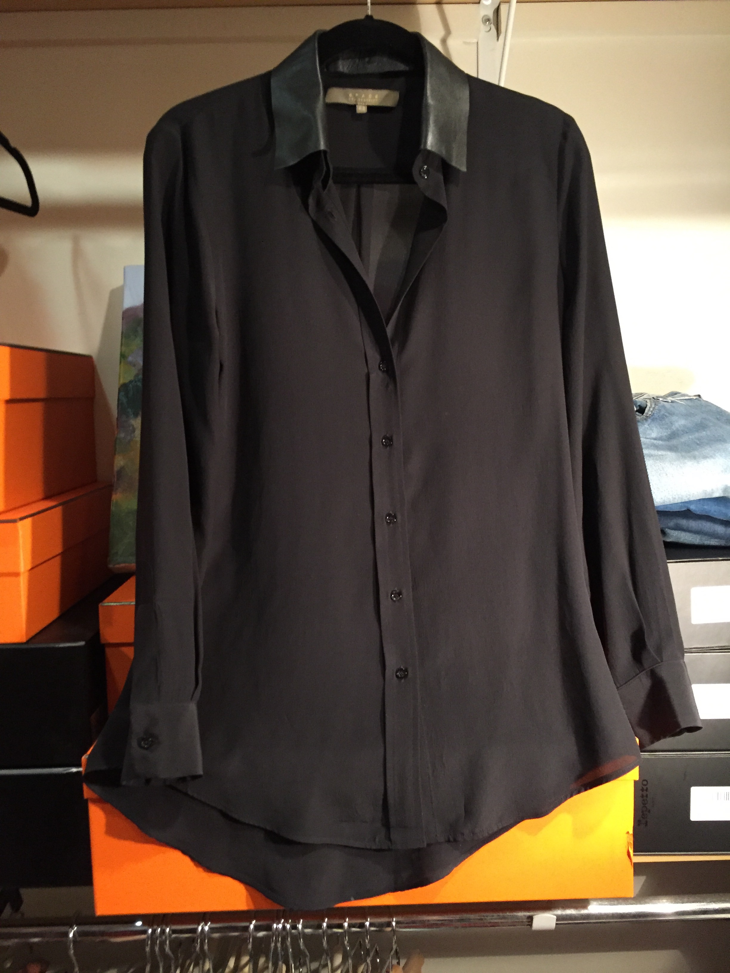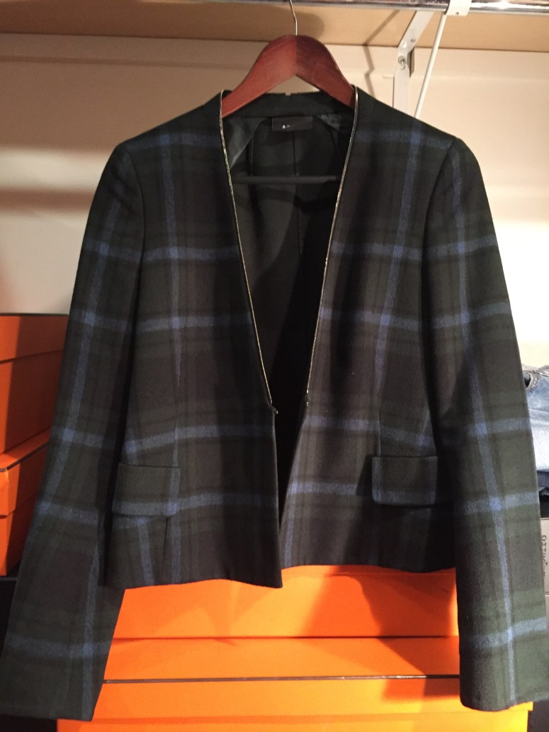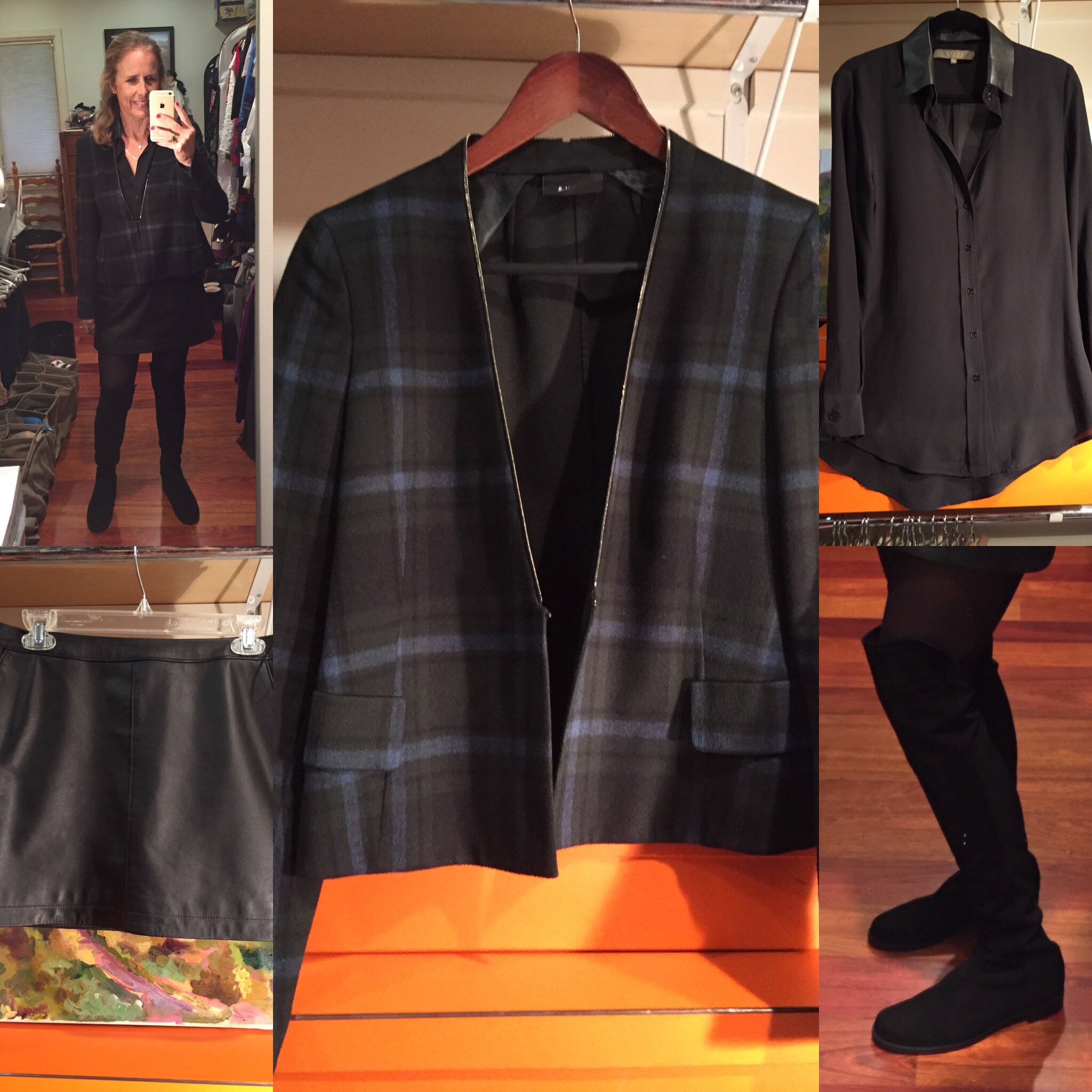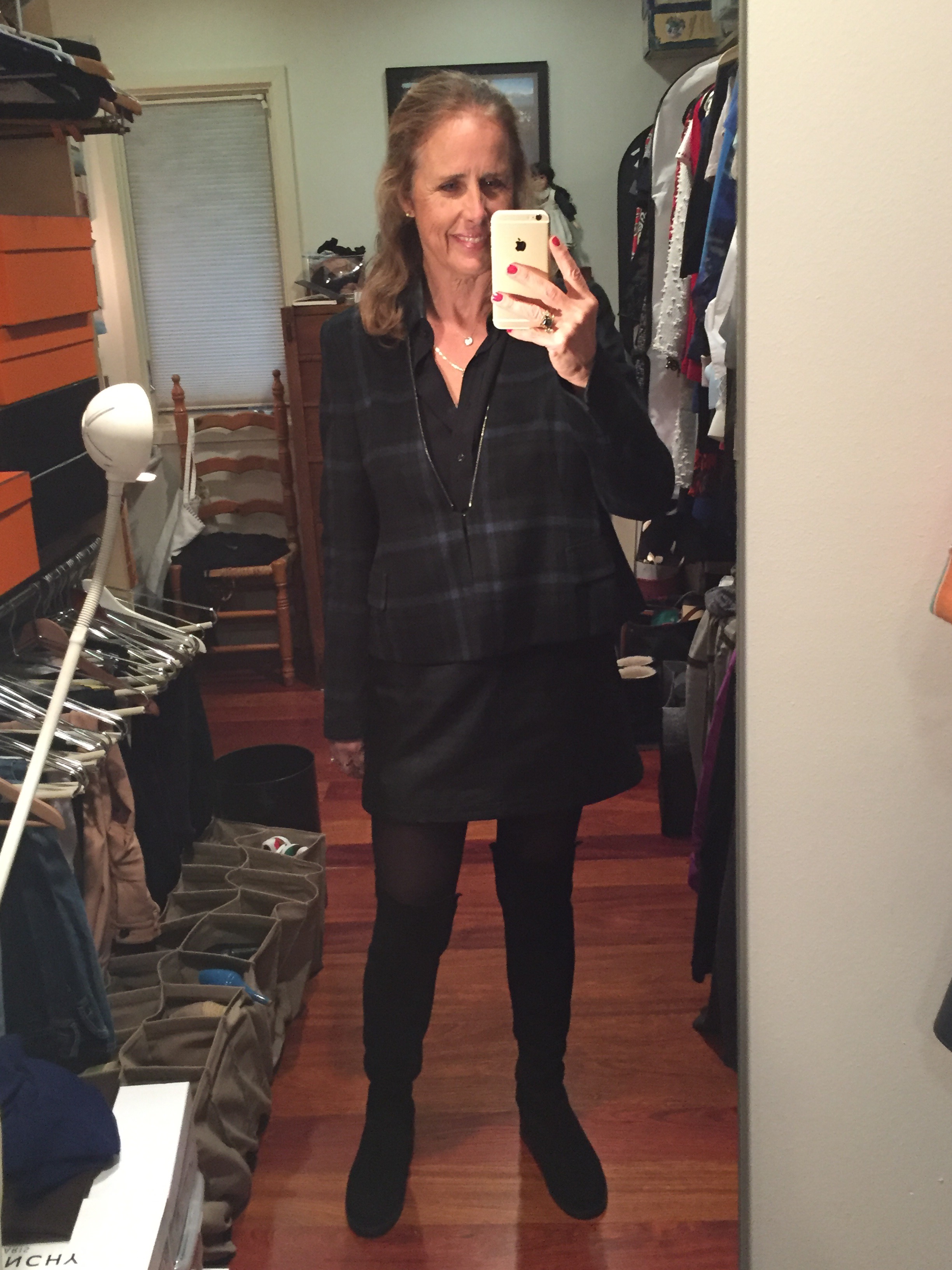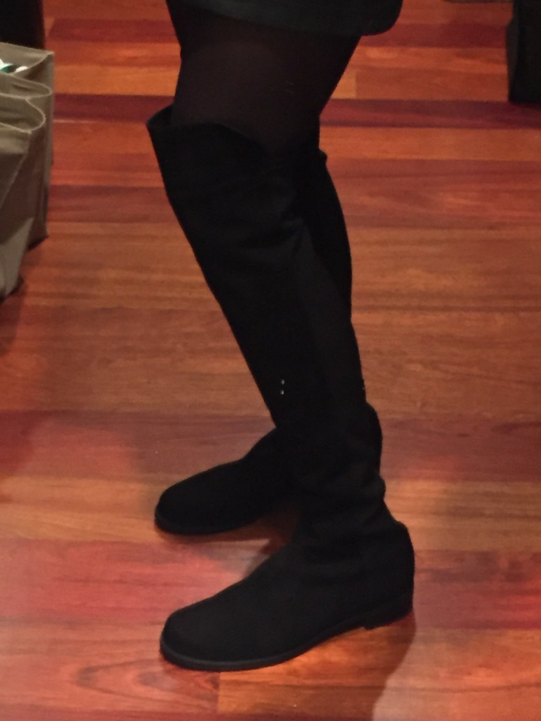 When I first took the flat heeled black suede over the knee boots out of the Stuart Weitzman box, I declared them a mistake — they were not as glamorous as my trademark Ferragamo heeled boots. But that is exactly why I needed the Stuart Weitzman boots — to keep my legs warm for those times I want to wear mini-skirts and dresses (my go-to wardrobe). So for lounging around today, and to lift my spirits, I put on the Weitzman boots — but instead of Wolford tights I used the Bloch ballet tights which are less expensive, more durable, and more casual. Mini-skirt: Joie leather with pockets. Shirt: a Space black one from Italy I rarely wear despite its comfort and elegance. Then, to bring out another item I rarely wear — an Akris silk cropped jacket I paid a lot of money for even though it was on sale. And this time I realized I could unzip the jacket’s collar so it would not compete with the leather collar of the shirt. Took me way too long to decide all this but at least I have matched my current favorites (boots, skirt) with two items I rarely wear (blouse, jacket). It’s all about cost per wear; otherwise, I would slouch around all the holidays in my Lululemon!