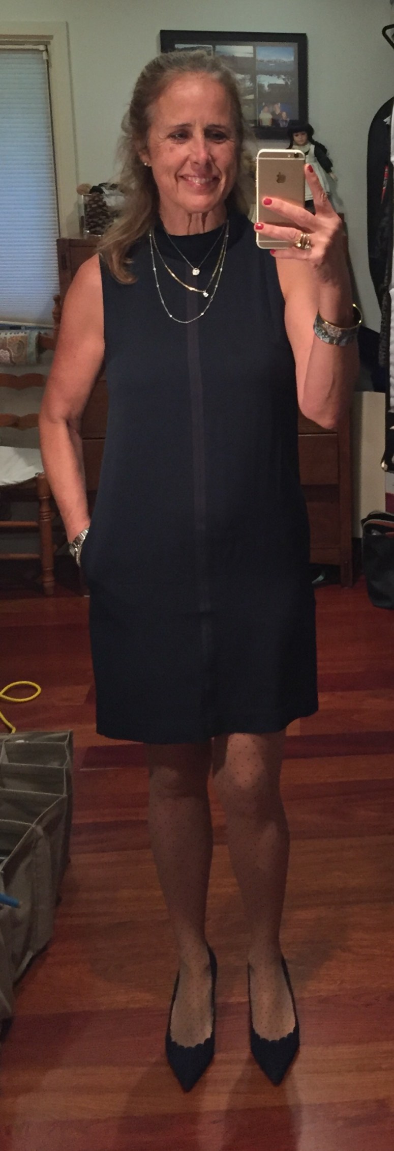 Kit and Ace’s “Ryder Sleeveless Silk Dress” for $248 (shown here in size 4) has pockets, a modest hem length (approved by my mom), and wears comfortably for easy elegance — especially paired with polka dot tights by Wolford and Navy blue Manolo Blahnik suede heels.
