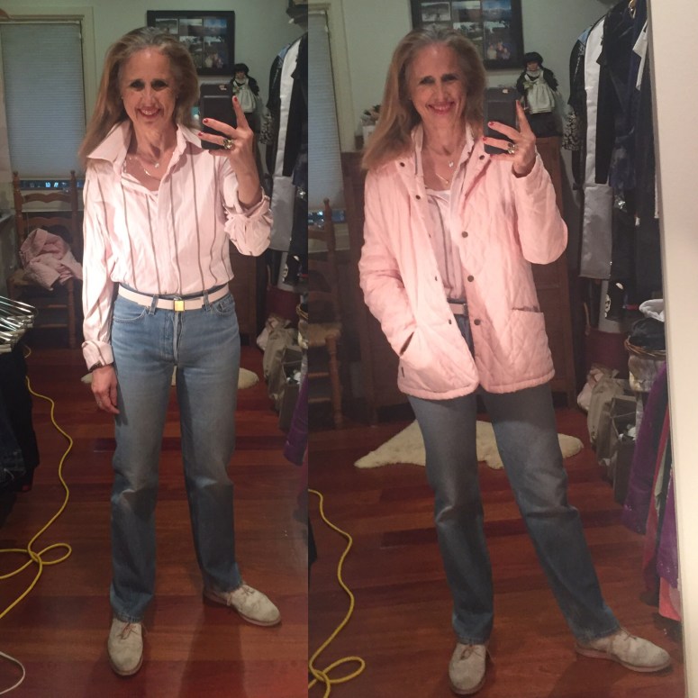 I had to be responsible today and go to the hardware store for supplies so I decided to wear some casual clothes I have not worn in awhile: a Pink striped shirt, Levi Strauss vintage high waisted wide leg jeans and a pink Barbour jacket that once fit but is now many sizes too big — oh, and a pair of gray and pink Cole Haan saddle shoes. I hate the outfit. All the clothes are good quality but except for the jeans and shoes, meaning the shirt and jacket, everything is too big and I don’t feel glamorous or elegant and I felt quite frankly icky. But my hardware store is True Value Hardware on Fair Oaks in Pasadena and the nice staff made some jokes and helped me out with each item so the trip was salvaged — showing that even in LA people have not lost their sense of humor or their kindness. But I am still getting out of these clothes!