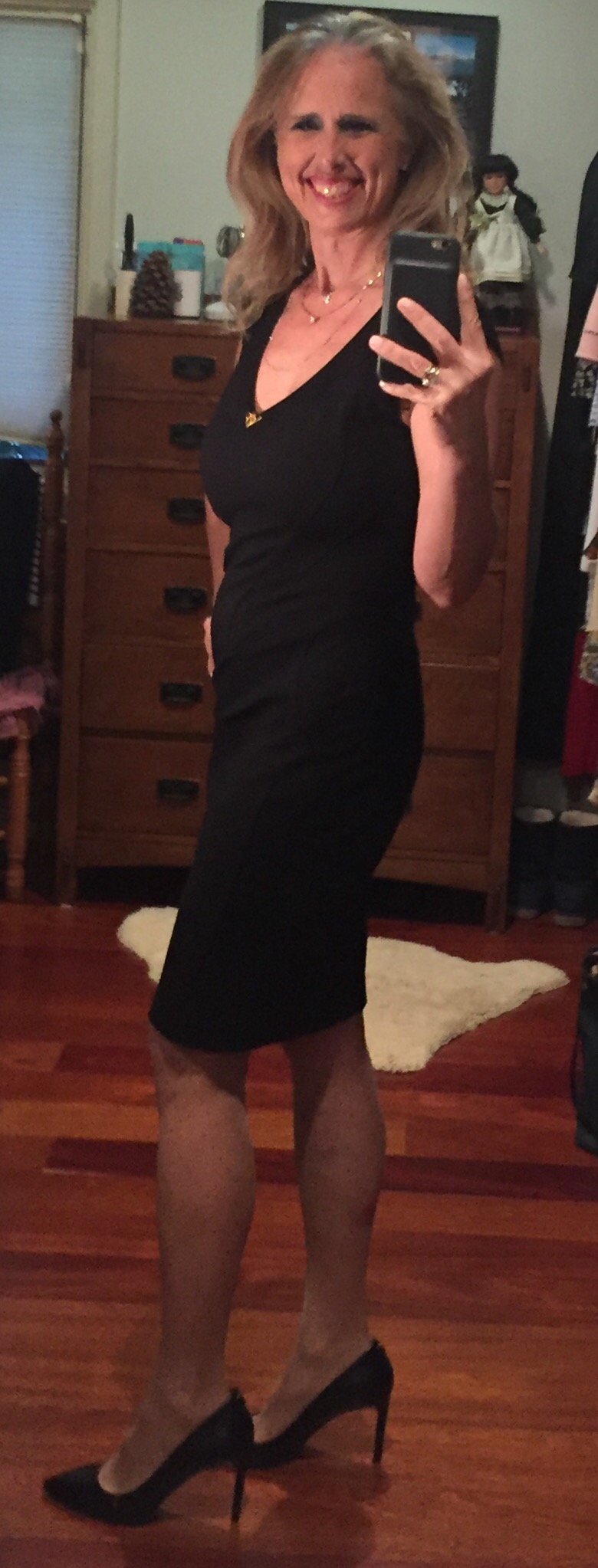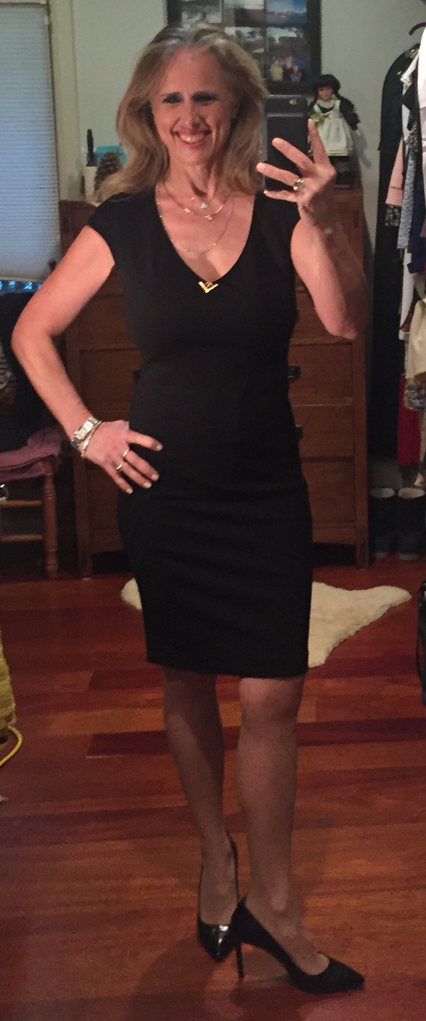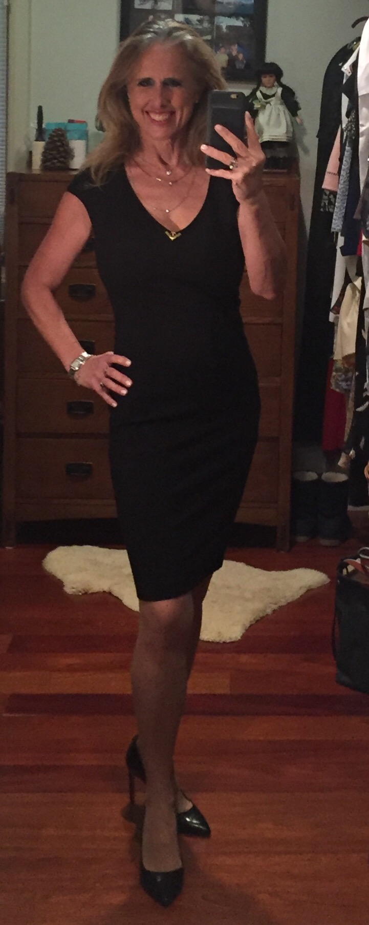 This little black dress by Roberto Cavalli is super soft, super comfortable and makes me fantastic. I added glamour and more comfort with Wolford tights and decided only stilettos (these ones are by Hugo Boss and have a matching handbag) could do the outfit justice. Today I want to feel free, a bit daring — I want to please myself, to find out what I like. This is menopause. I’ve had many roles in my life but right now, while I let go of a few things, I am trying to enjoy the sense of freedom. Because what’s next just might depend on me. Time to be a big girl.