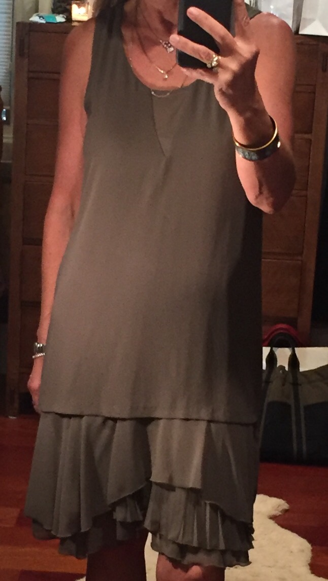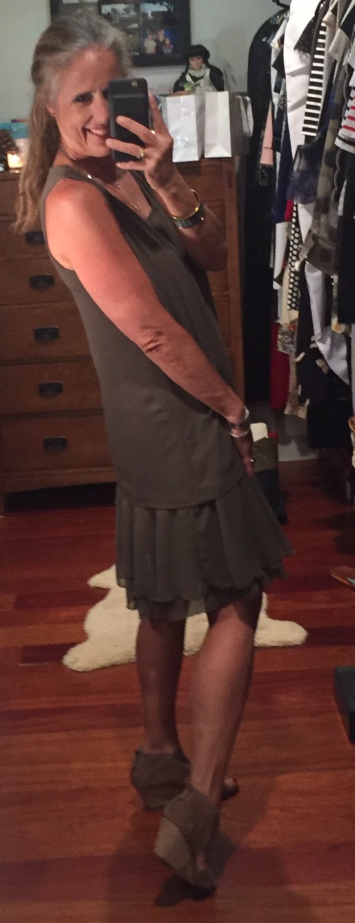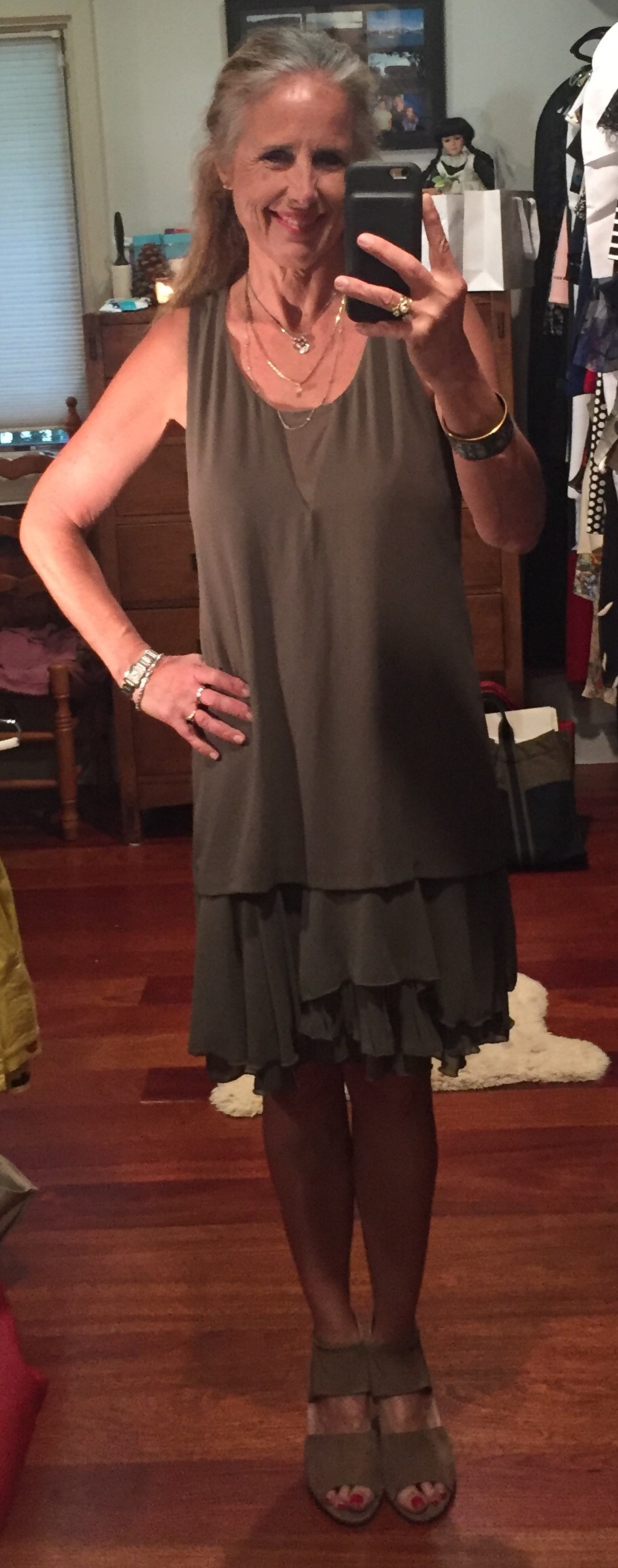 Warm temperatures in Pasadena today dictate a light sundress and for St. Patrick’s Day I chose these green dress by Kaos (made in Italy) which I purchased a few years ago in Umbria. The dress flows easily over the body, carved out a beautiful sillouette for the shoulders, has a triangle of mesh for a little daring around the busom, and ends in layers of fun ruffles. Kaos is an affordable Italian brand that offers good quality. I paired the sundress with heeled sandals from Eileen Fischer to give some definition to the calves (and it is warm enough today to skip wearing Nylons although my varicose veins are prominent — but hey, I’m 55 years old, and this is the way it is!)