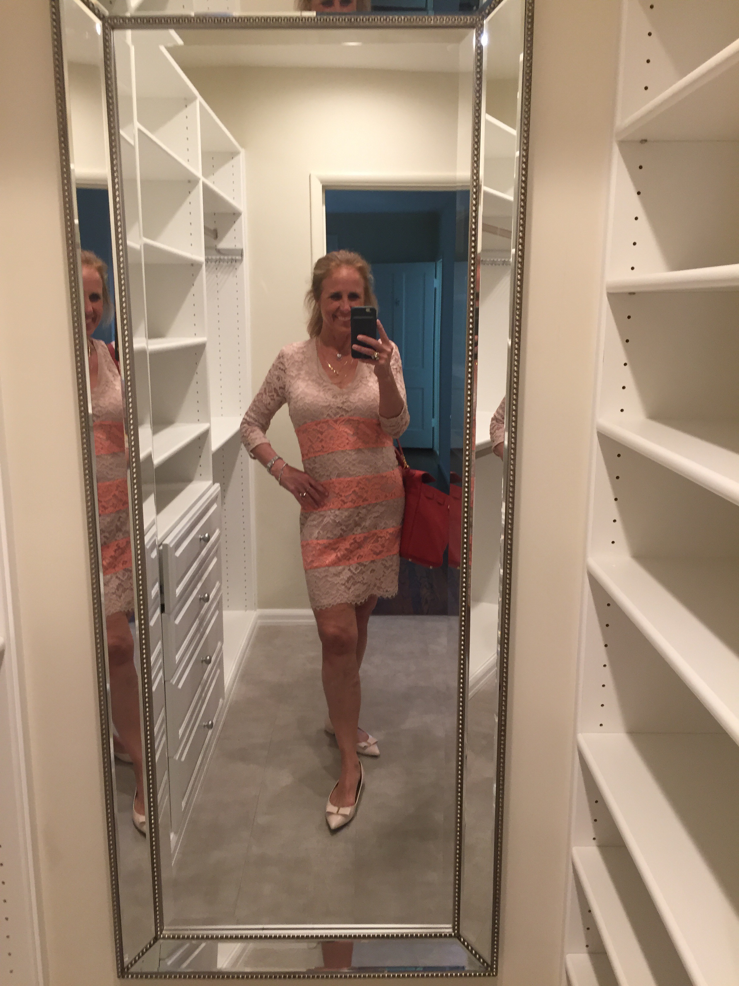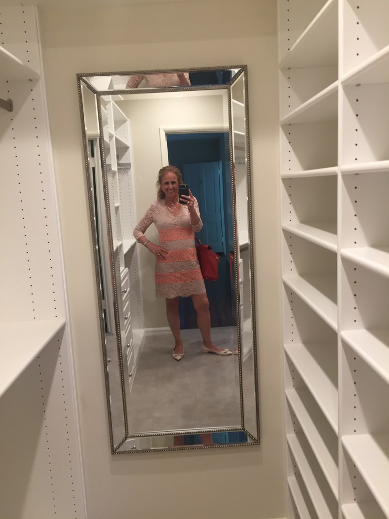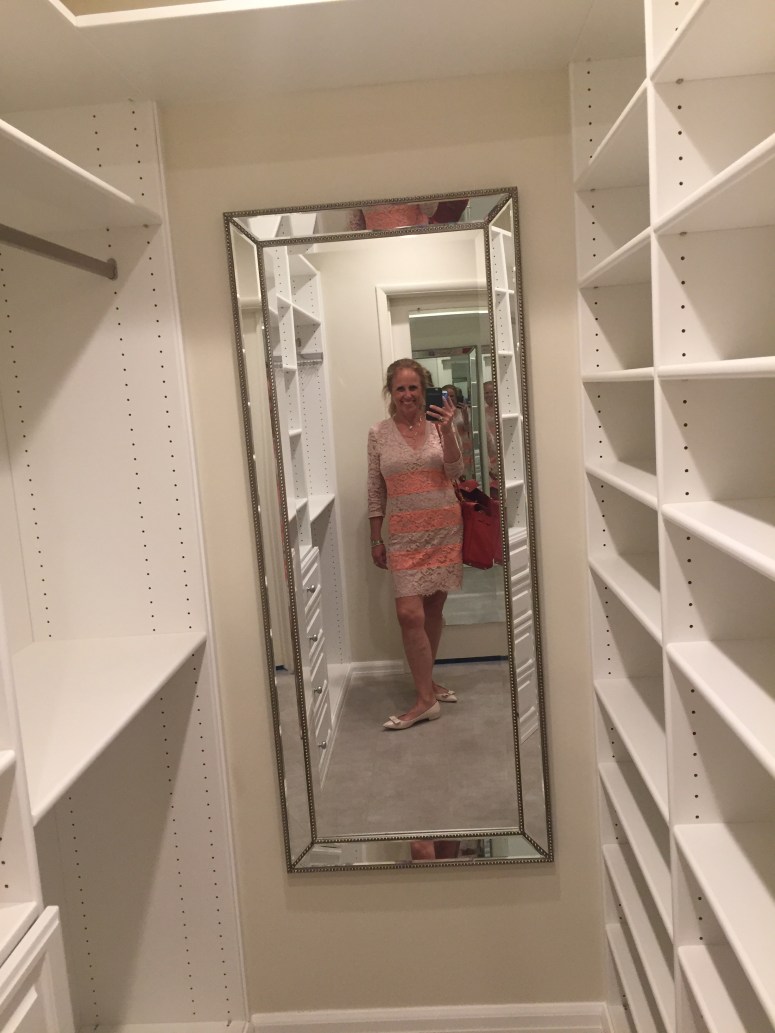 My new home has a gorgeous organized closet. I am looking forward to blogging about clothes (and menopause) and I took a few photos to show it has places for clothes, handbags and shoes and lots of lights and mirrors. When I was looking for a new home for the next year or so, I wanted a place that would enable me to write about clothes and handling change and being in menopause. Okay, really it’s just about the clothes — the wardrobe behind the woman who changed her life. Don’t we all have a story?