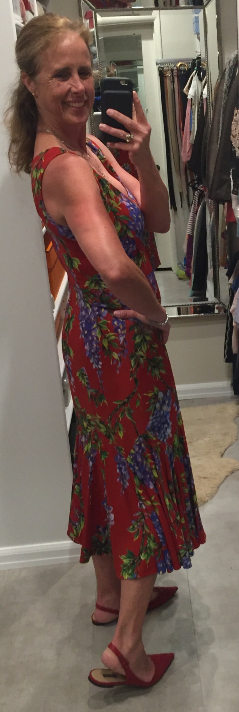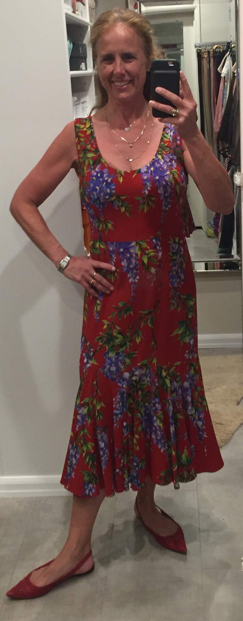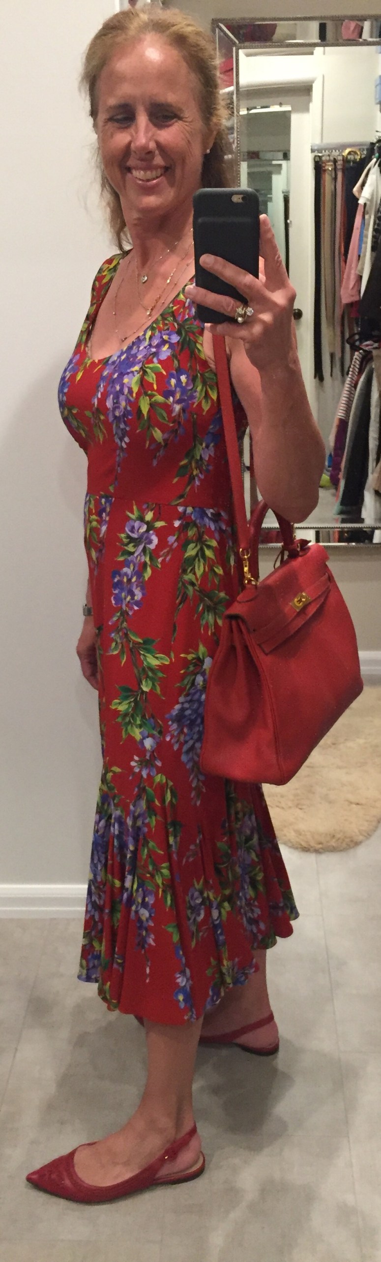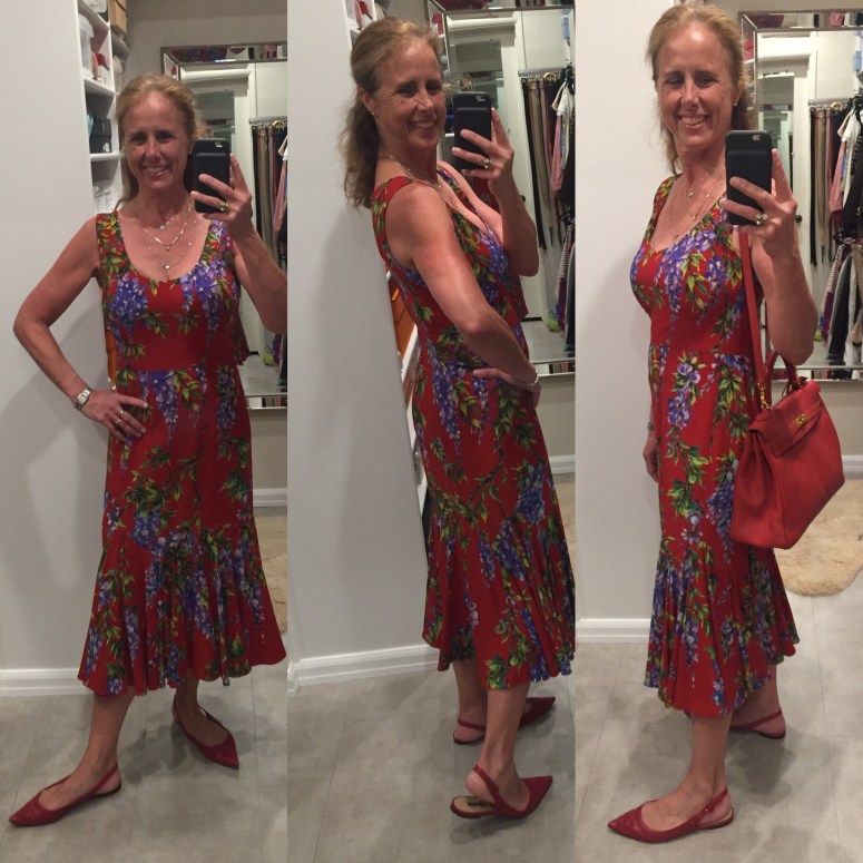 I bought my first Dolce and Gabbana dress at an outlet store north of Florence. I had been looking for a good price and the right style from this season for a year — and I love this dress. It is modest and gorgeous and makes me feel like I can handle any situation! (And we found matching shoes!) As for the measurements, I am 5’7″ and this is a size 42 Italian.