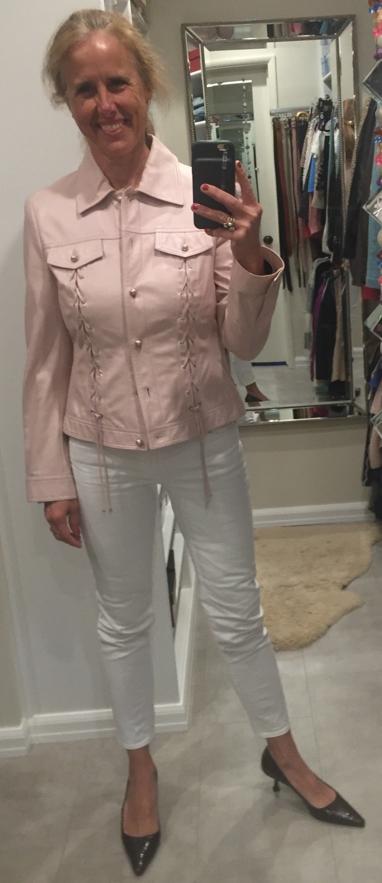 I found this pink leather Escada jacket (with the beautiful buttons) in the back sales room of the consignment store Clothes Heaven (Pasadena, CA). The price made me overlook the pastel color but I love it!