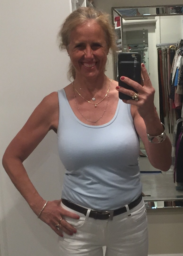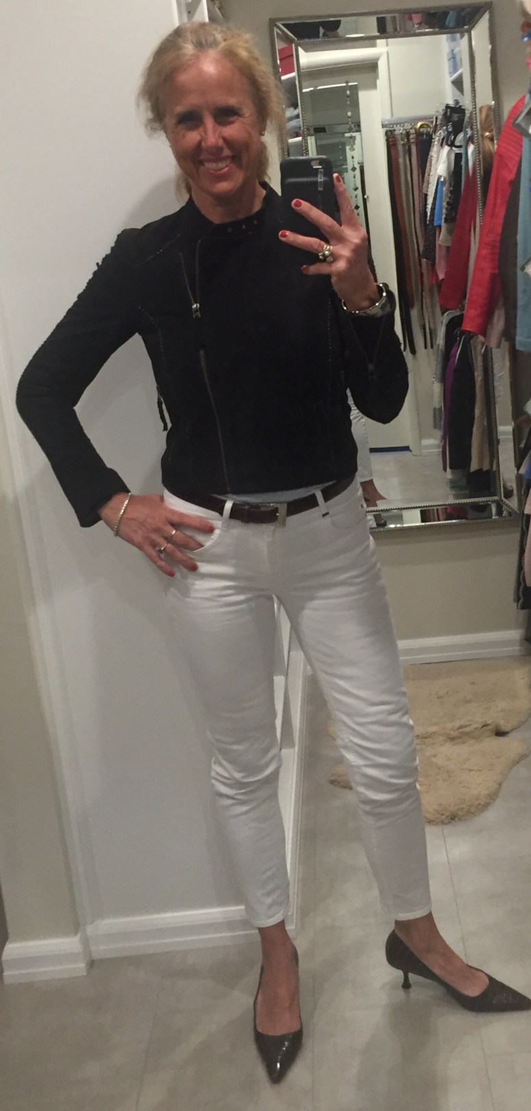 Obviously I am freaking out about writing my novel if I am dreaming of getting a motorcycle. But the first step for me is the leather jacket. For going to the office on Friday, I decided Majestic Filatures light blue tank t-shirt (soft, supple, shows off the shoulder muscles I have built by workout out early mornings); white jeans (Hugo Boss are one of my favorites for the slim fit); and Manolo Blahnik crocodile pumps I bought “used” from my favorite consignment store, Clothes Heaven in Pasadena.