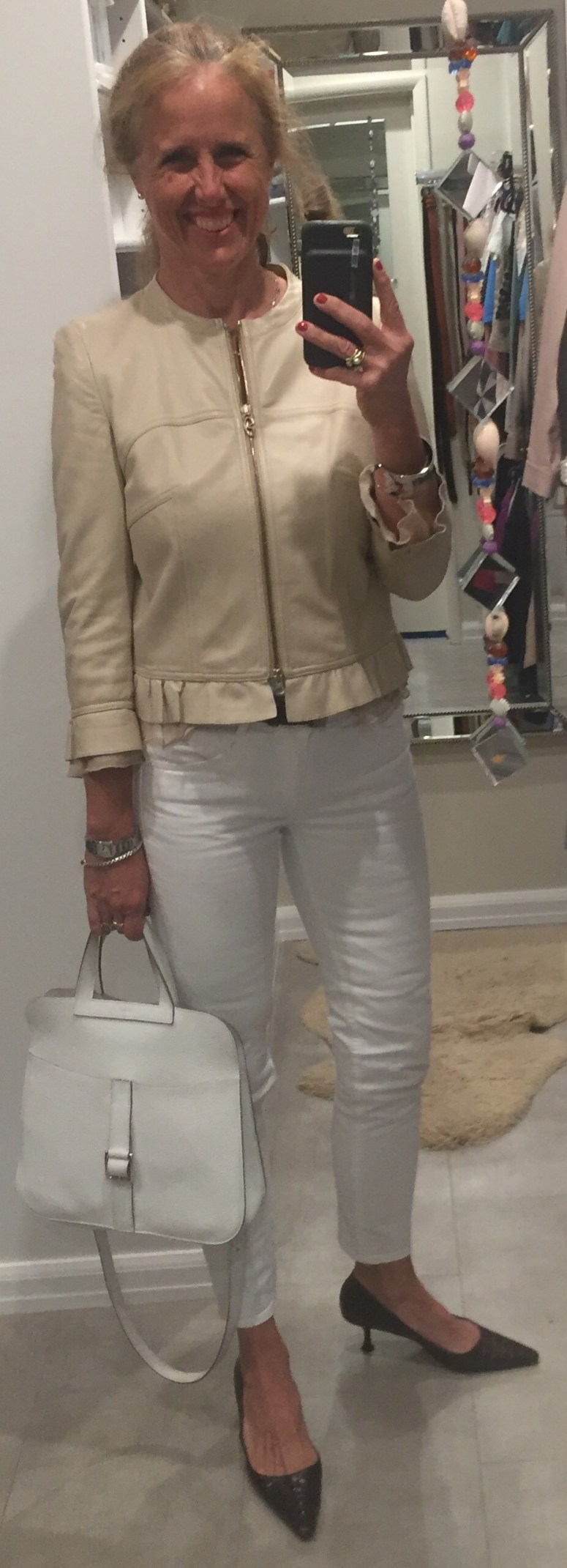 And this is my favorite — a Valentino leather jacket with ruffled trim. The jacket is lambskin and made in Italy and the fit and feel is perfect and the neutral color makes it versatile.