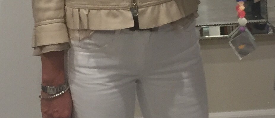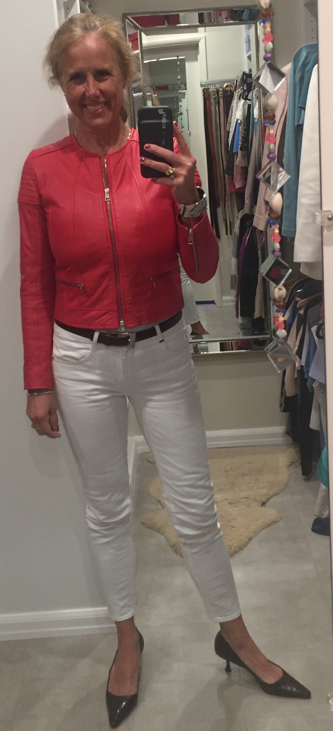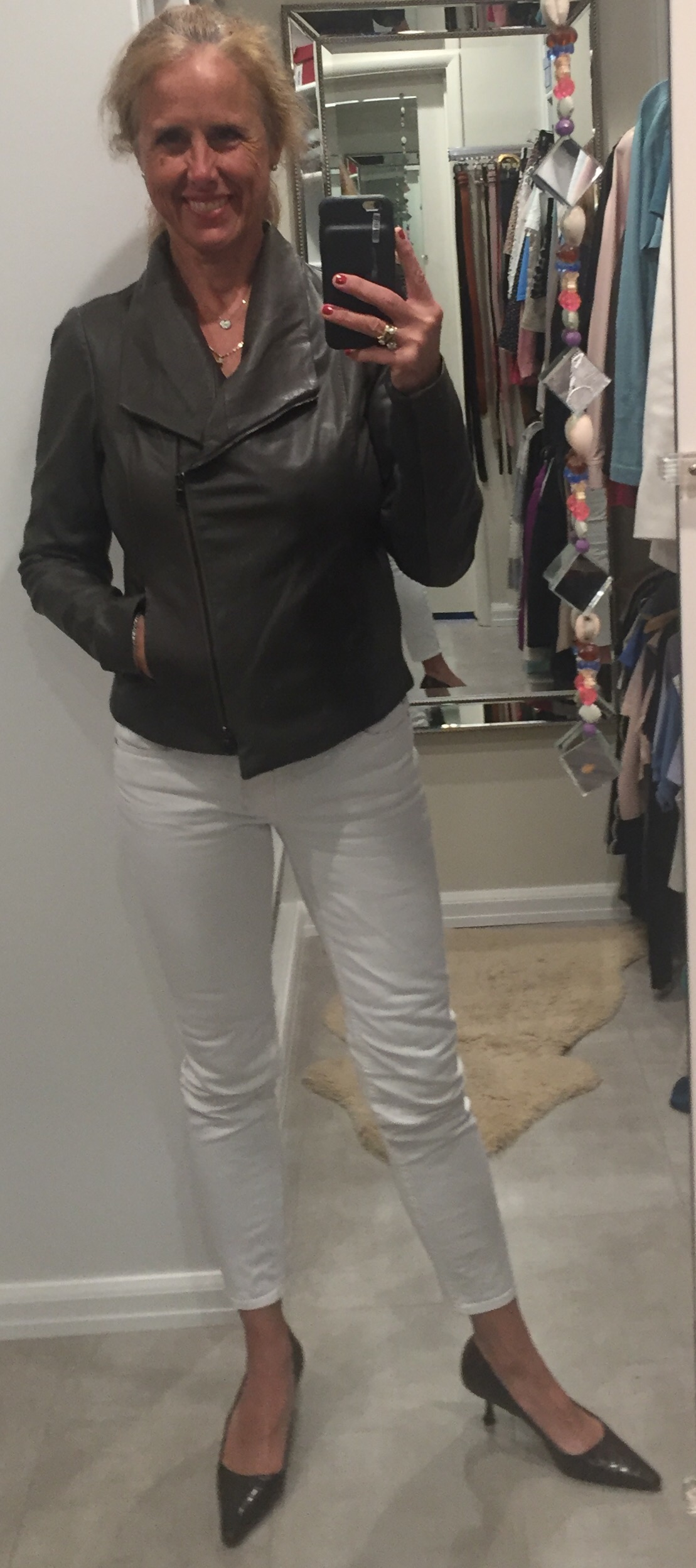 Obviously I am freaking out about writing my novel if I am dreaming of getting a motorcycle. But the first step for me is the leather jacket. For going to the office on Friday, I decided Majestic Filatures light blue tank t-shirt (soft, supple, shows off the shoulder muscles I have built by workout out early mornings); white jeans (Hugo Boss are one of my favorites for the slim fit); and Manolo Blahnik crocodile pumps I bought “used” from my favorite consignment store, Clothes Heaven in Pasadena.