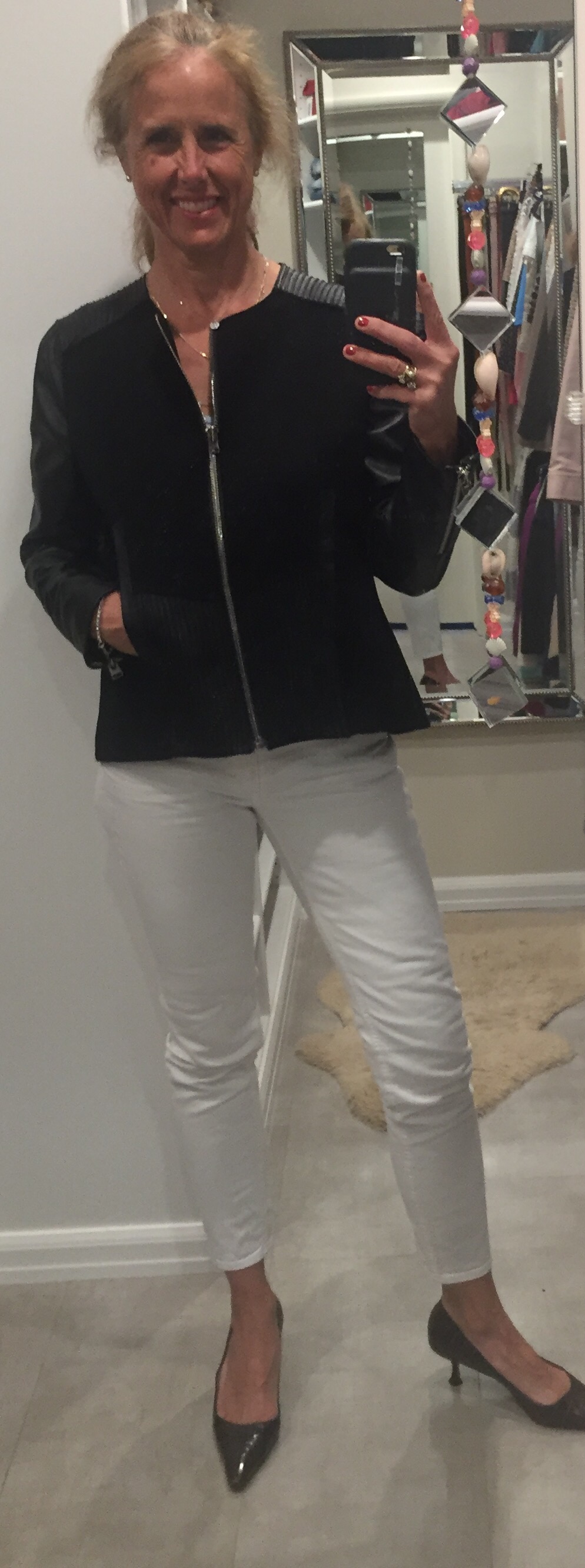 This Anne Fontaine jacket has leather sleeves and panels and a smooth finish polyester background so we’re just flirting with leather — still safely classic for anywhere.