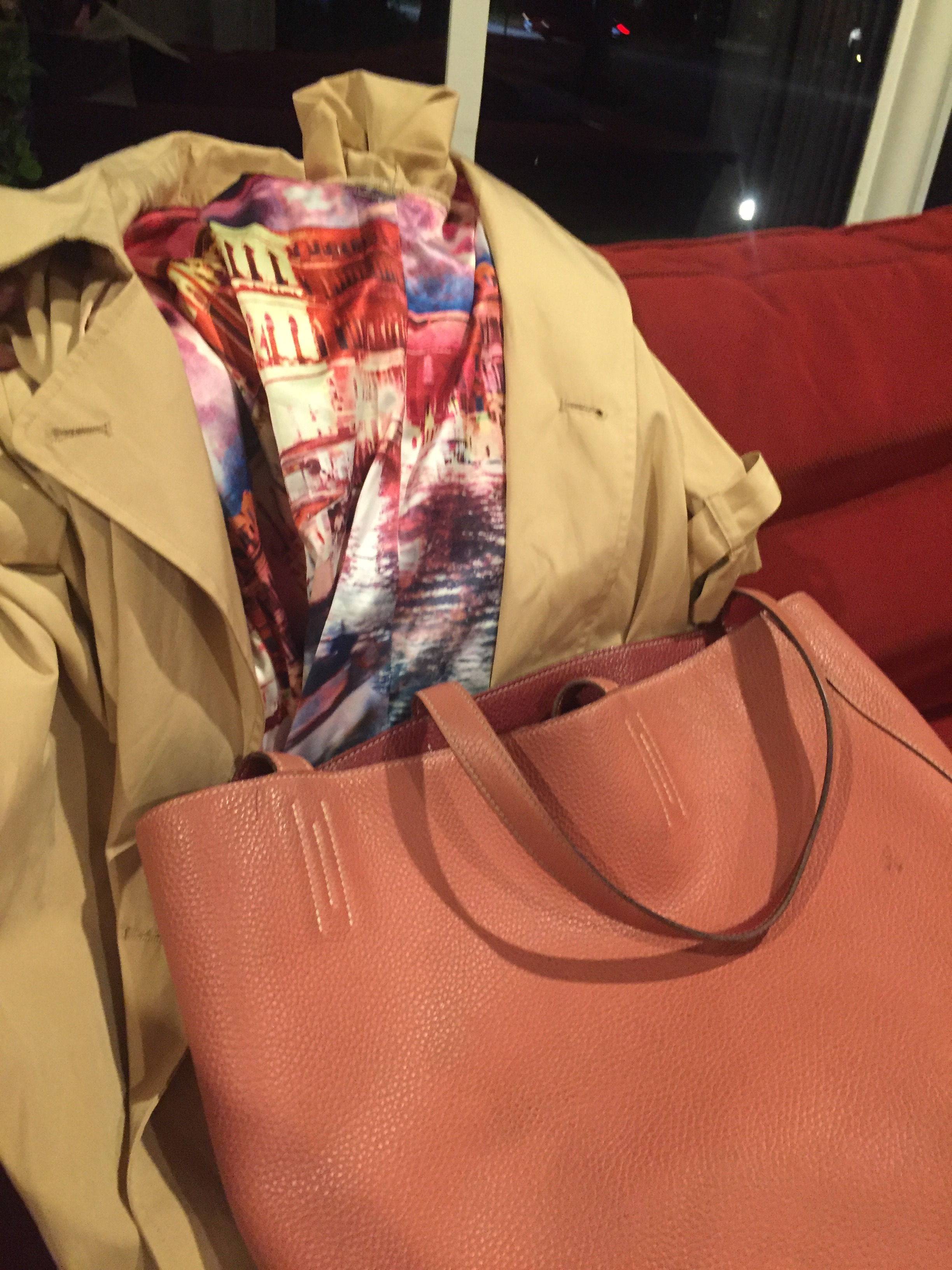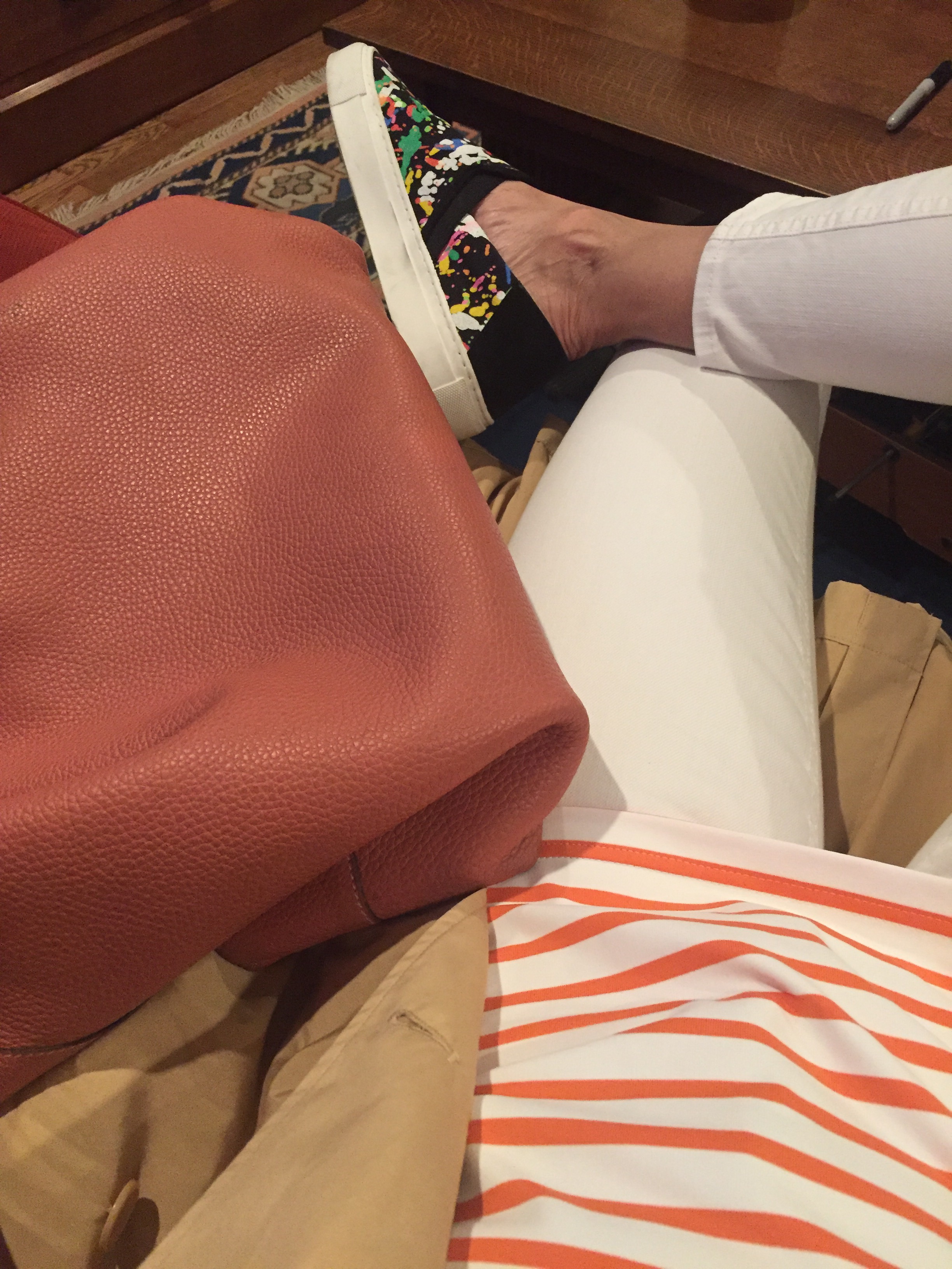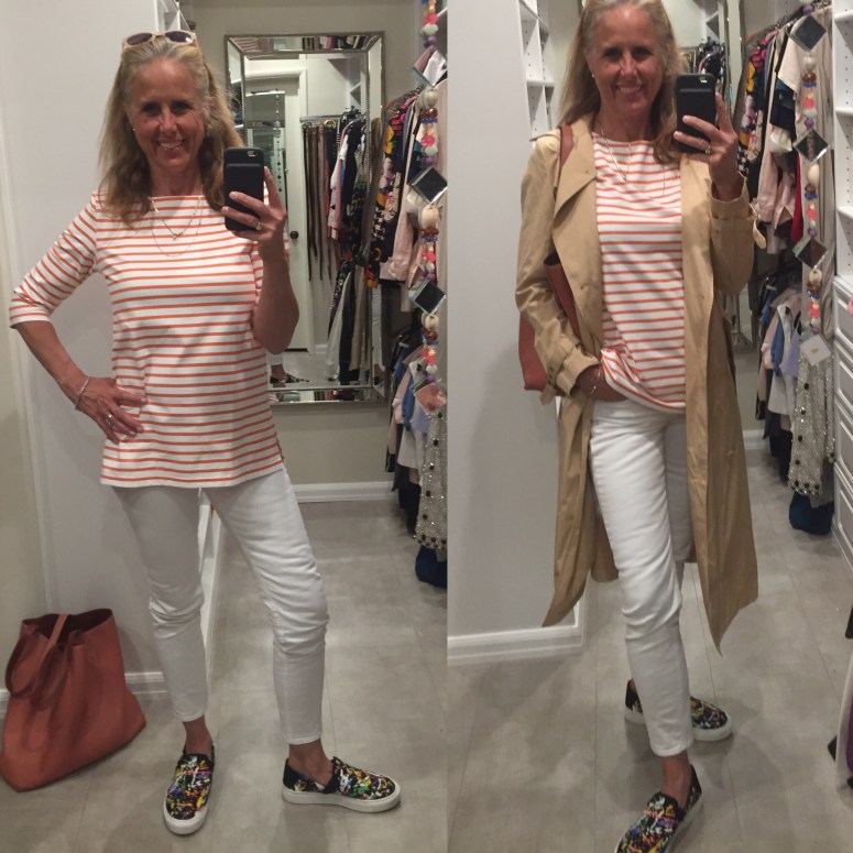 I have quite a few of the Saint James tops and a new orange striped one inspired me to pair it with white jeans, the Repetto sneakers and a buttery yellow Robert Graham cotton trench coat and a pink Hermès leather tote.