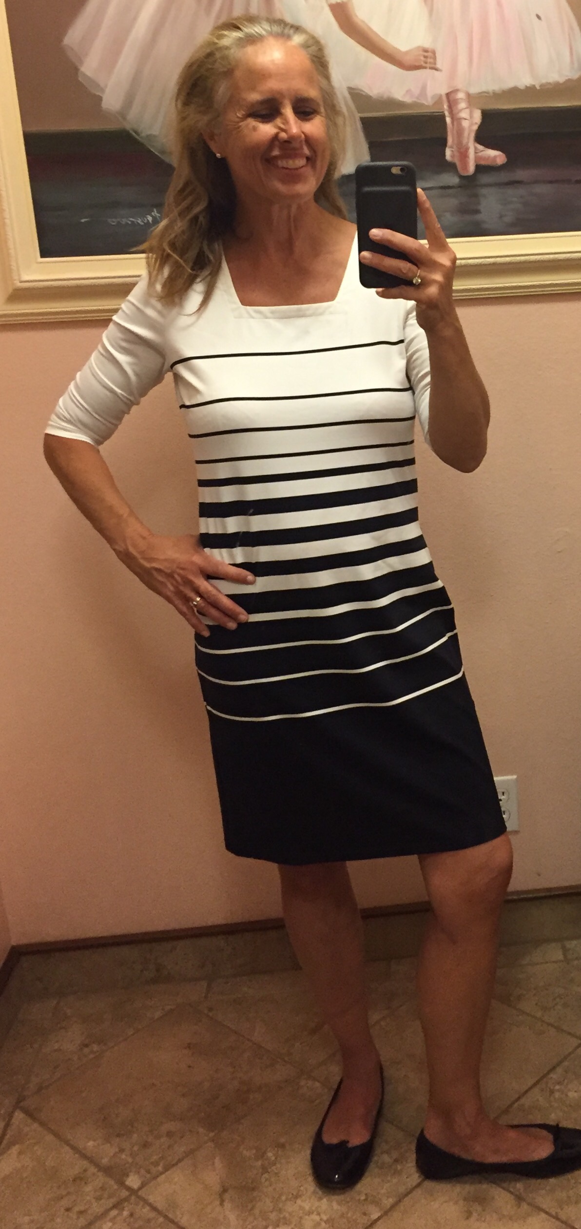 This stretch cotton dress with a flattering open back required me to put it on, zip it up backwards and then flip it around (a true fitness test I inject).