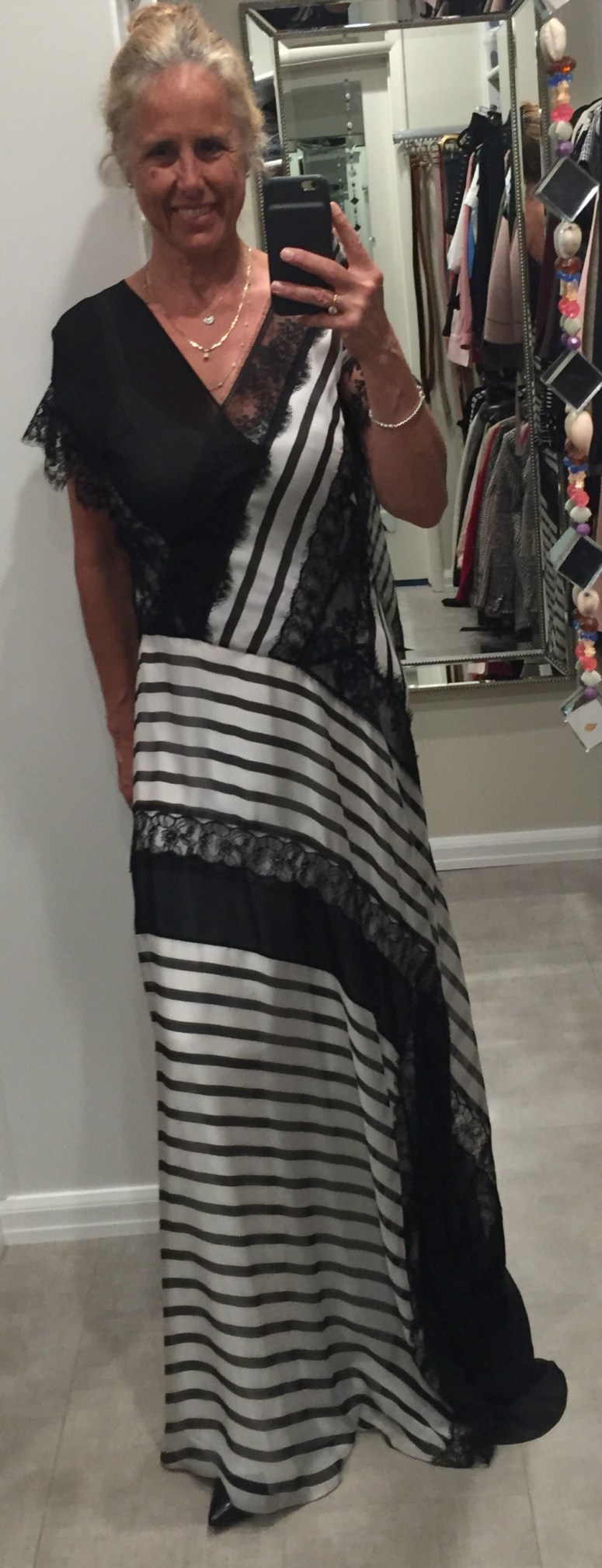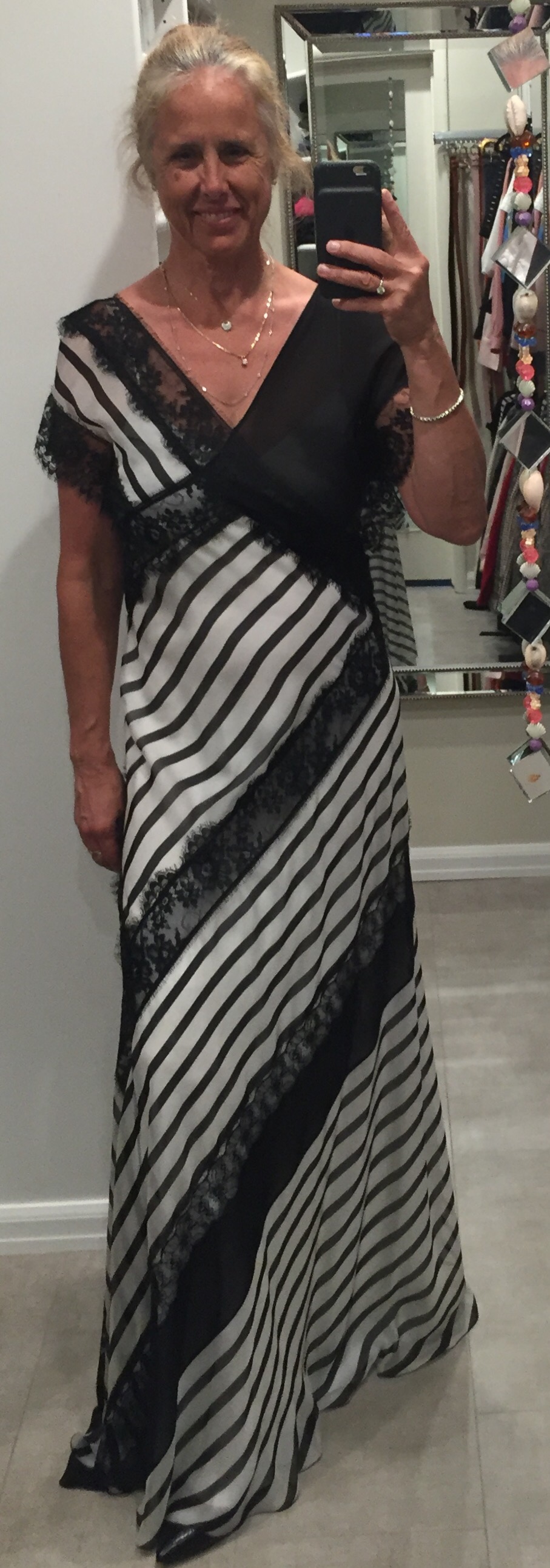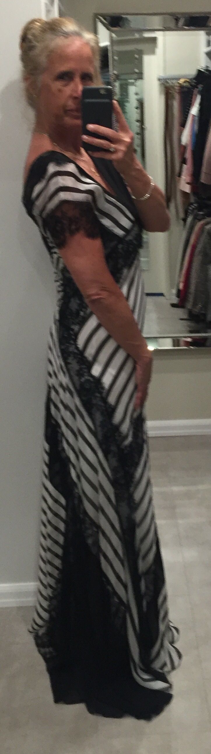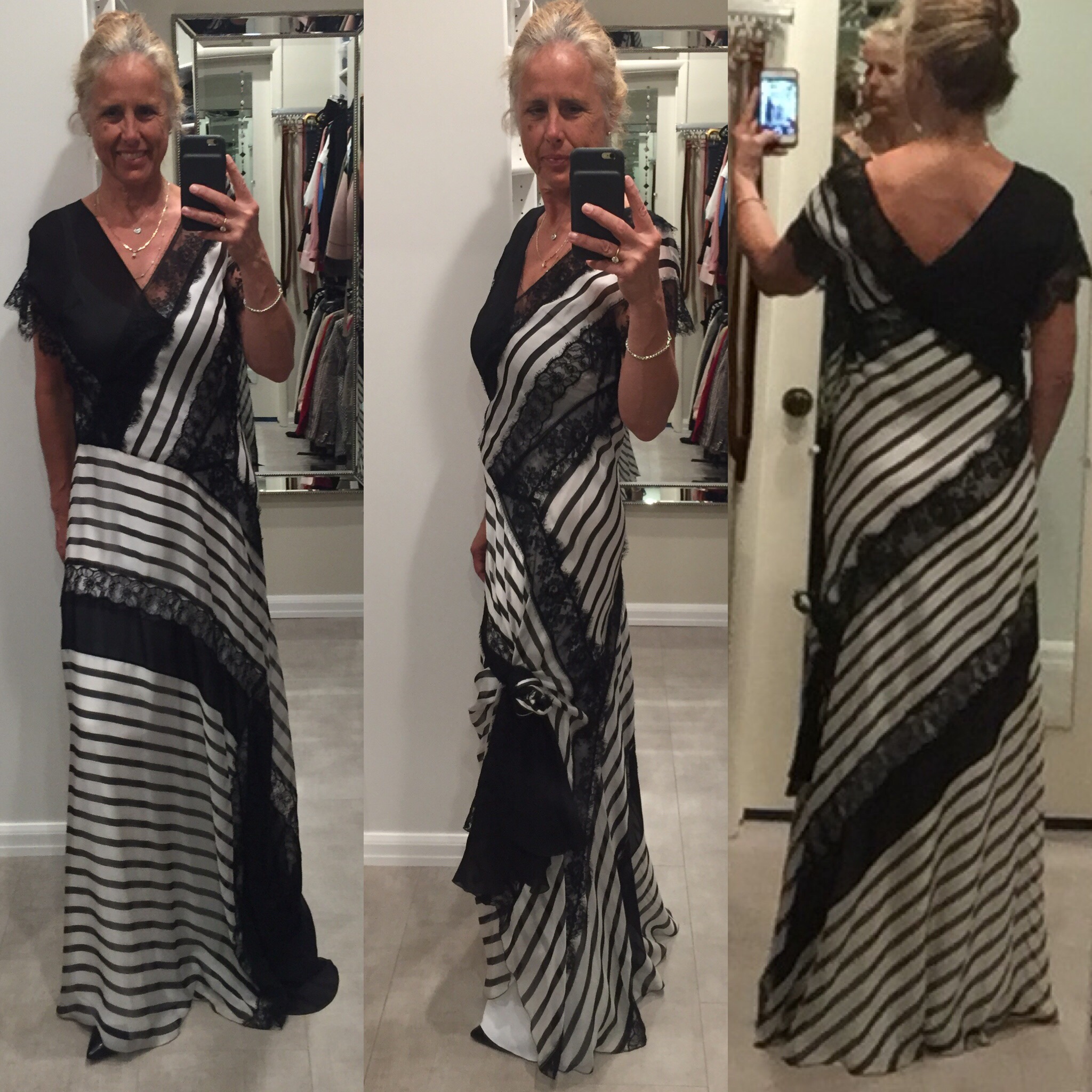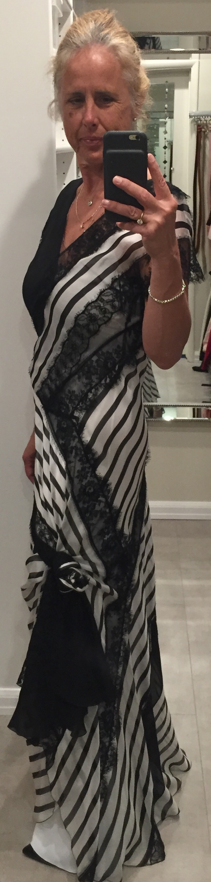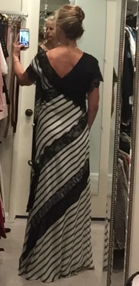 Which way is the front of the dress? Snaps underneath the armpit. A long white silk slip layered with lace and more silk that drapes on the ground. Nothing is practical about this dress but I had to have it when it went on sale. Love is irrational. If I am reading at home, in my living room, you will find me wearing this Alberta Ferretti silk dress with my hair up.