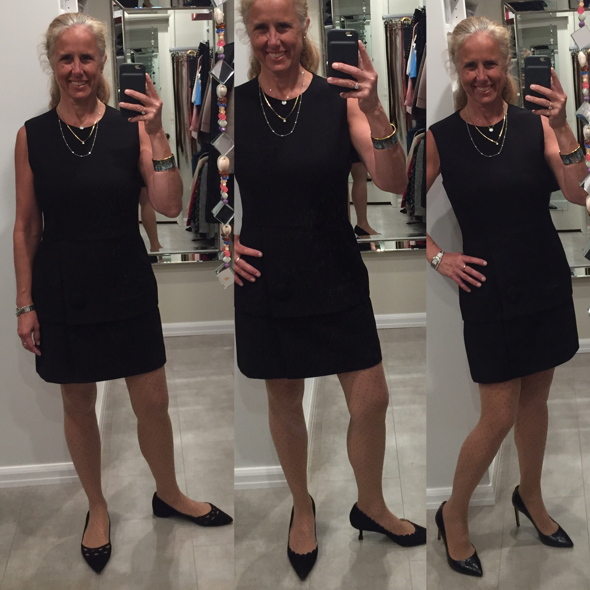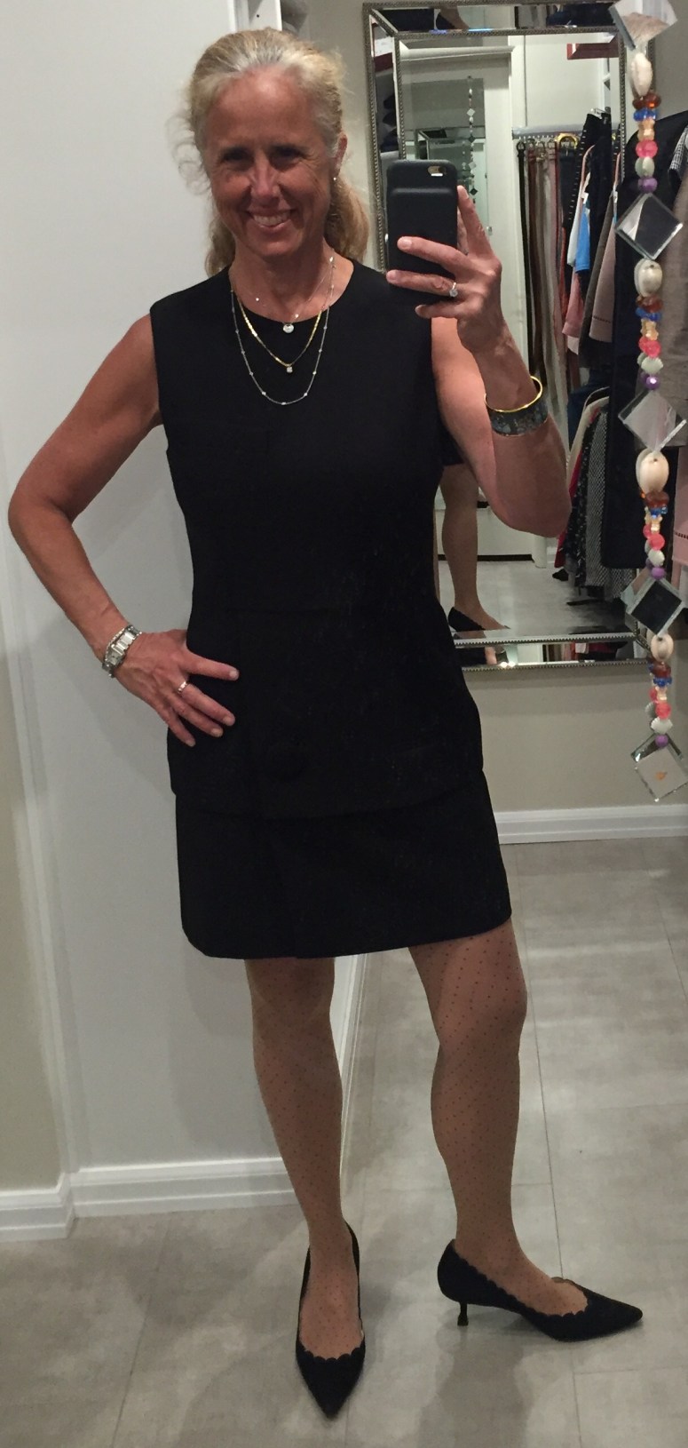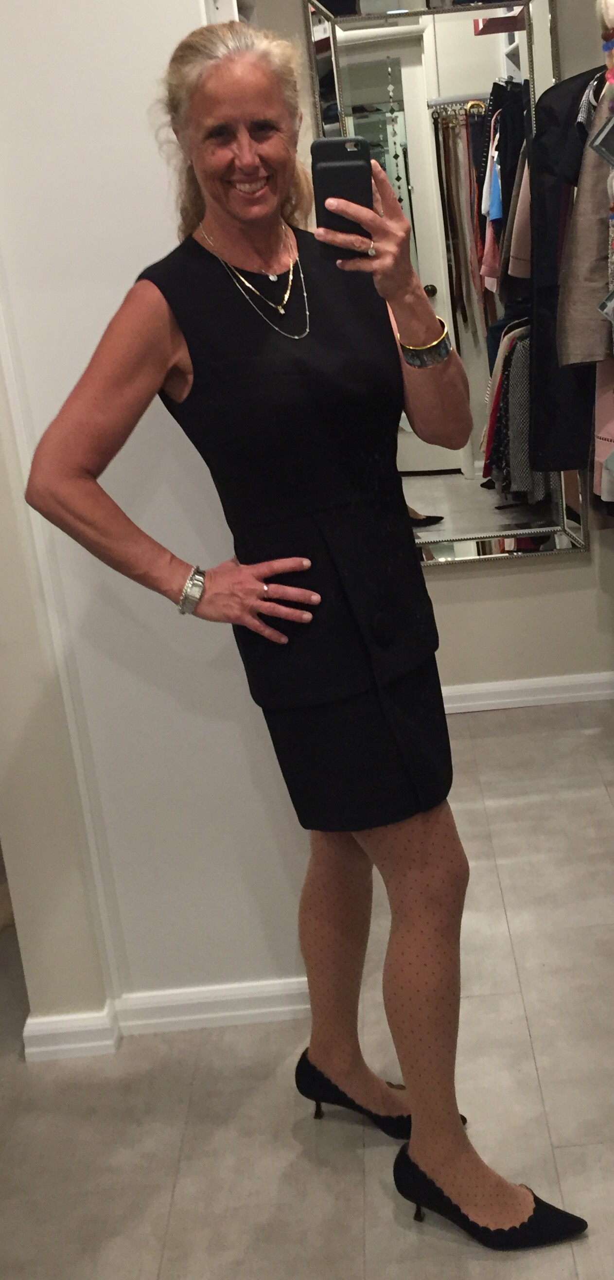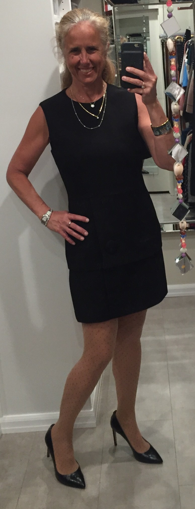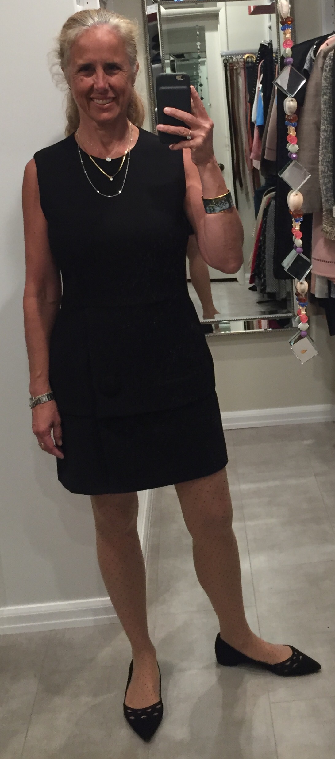 Balenciaga Paris has an outlet store in Cabazon (Palm Springs adjacent) where I have purchased a suede minidress, two black skirts, and now this tailored black sleeveless dress. The material is a silk blend, thick (forgiving, resilient) and structured (flattering and comfortable). This piece is a size 42 (I am 5’7″, 135 pounds). I love effortless, affordable, French chic.