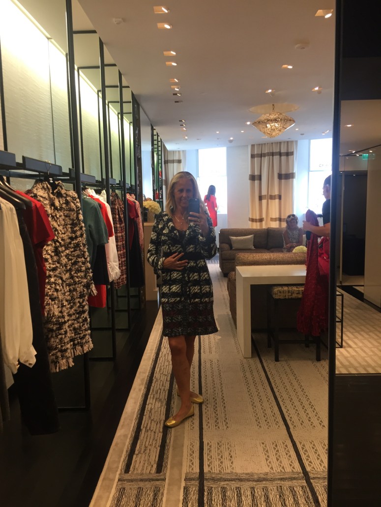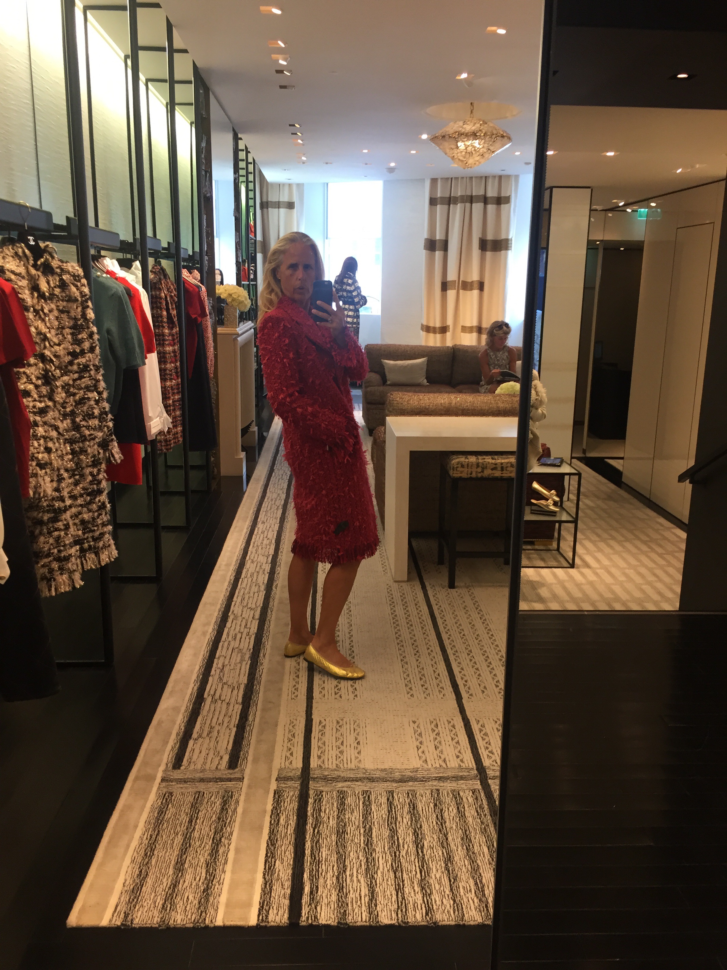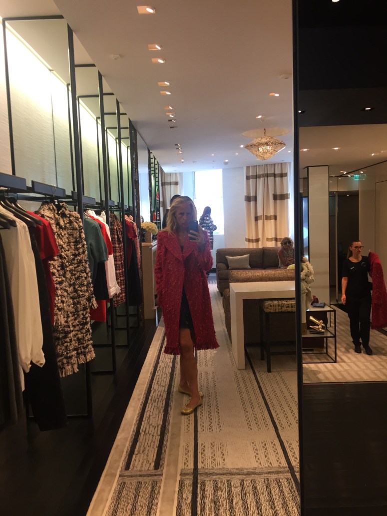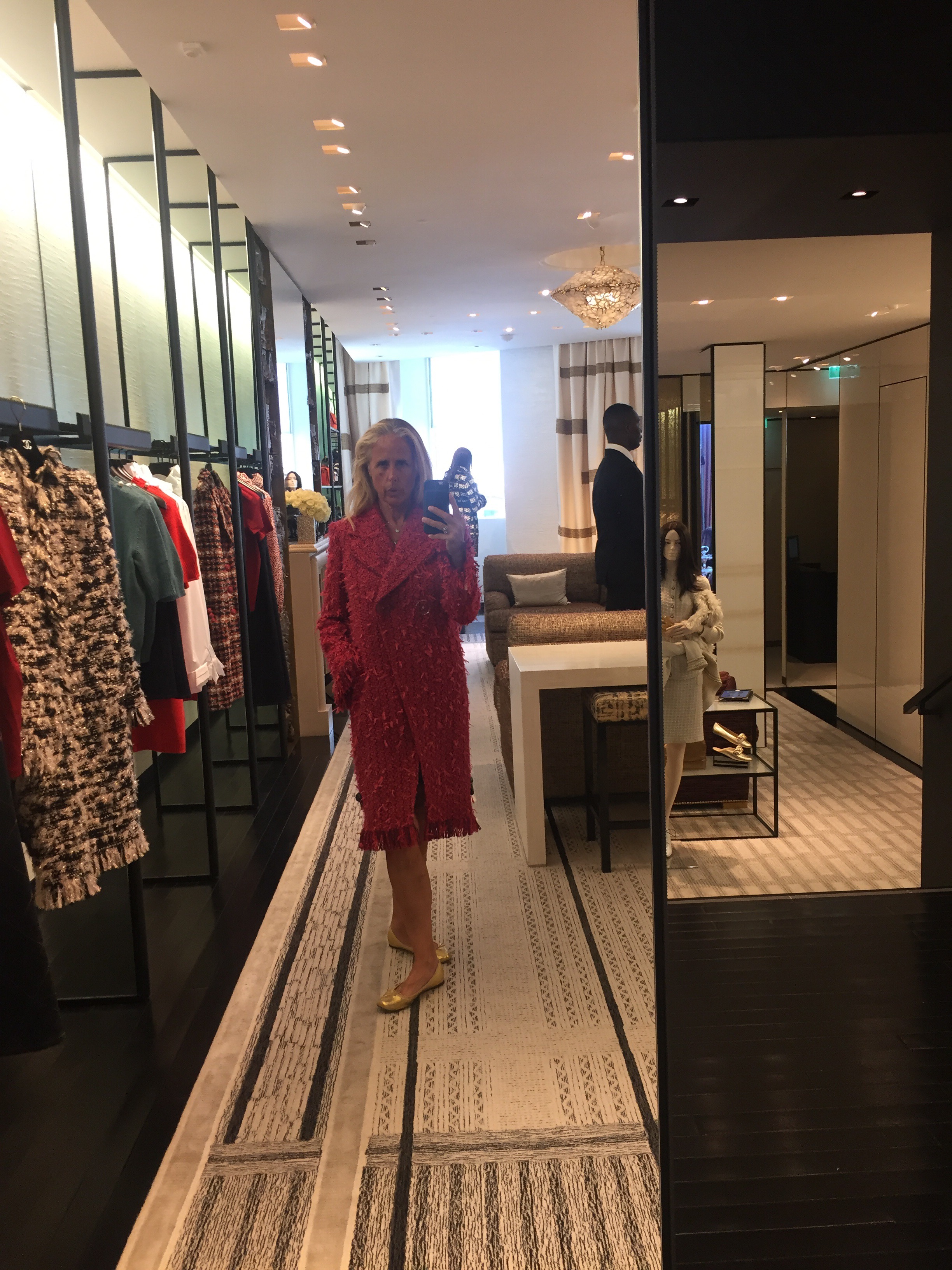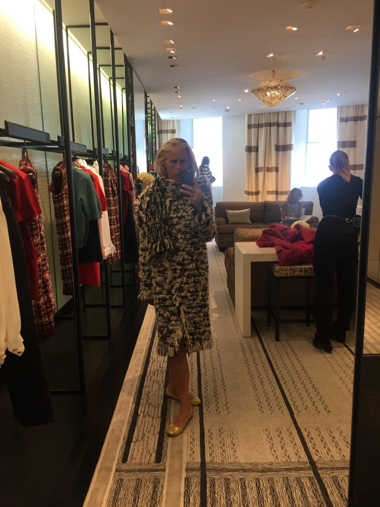 The Chanel Boutique is located next to the Piazza di Spana (Spanish Steps) and was the first store I tried on clothes last week. I adore Chanel — jackets, coat dresses, and ballet flats and I wasn’t disappointed by the visit. I tried on a few comfy coats, a big cardigan sweater (one size too small was all that was available) and an orange-red cashmere dress. I did not purchase any one of these as they were not on sale but you can join me in looking at a few items of from the new season.