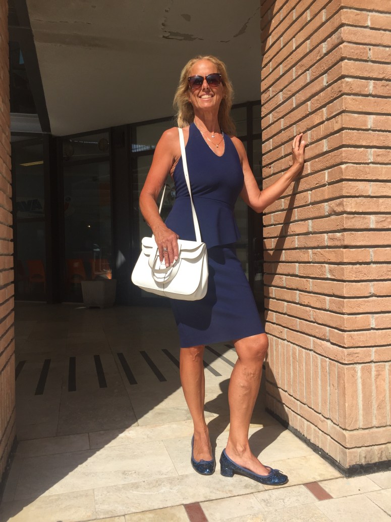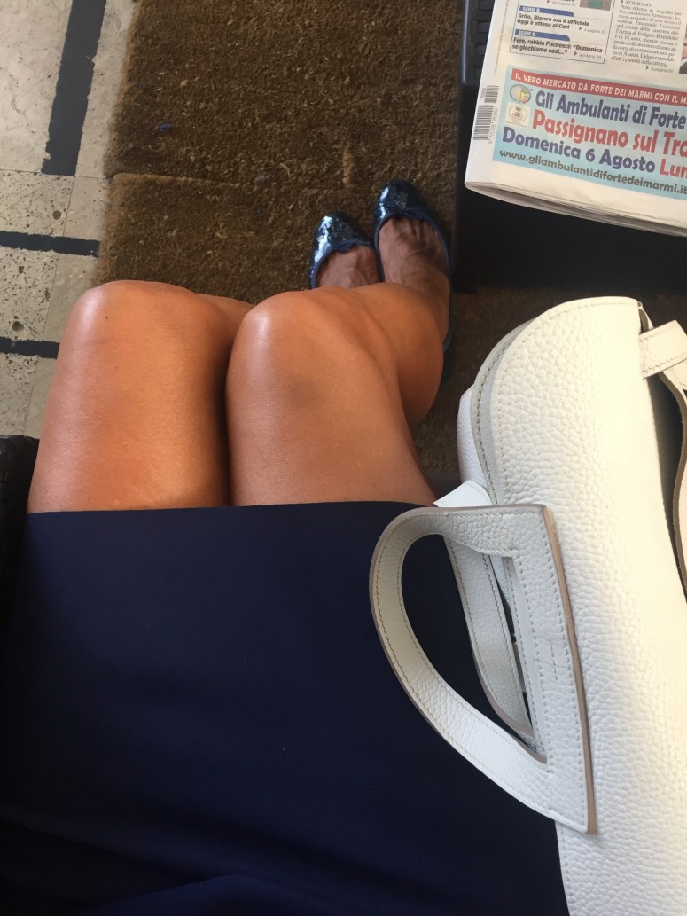 This blue halter dress by Chiara Boni which I bought on sale from the store in Rome frees up the shoulders, arms and back to enjoy the summer warmth and breezes but maintains a modest length to just above the knee — making this dress easy to slip on and wear (wrinkle free, good for traveling). I add Repetto ballet pumps (also bought on sale via the online store) and a white leather handbag.