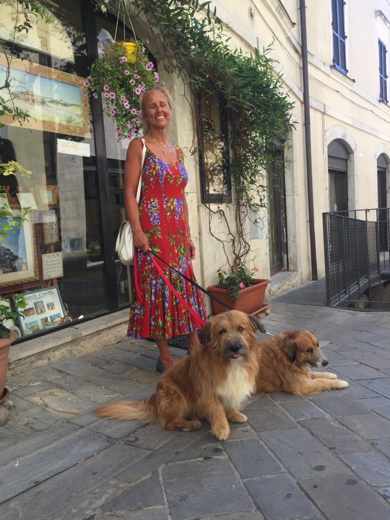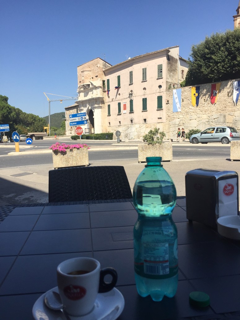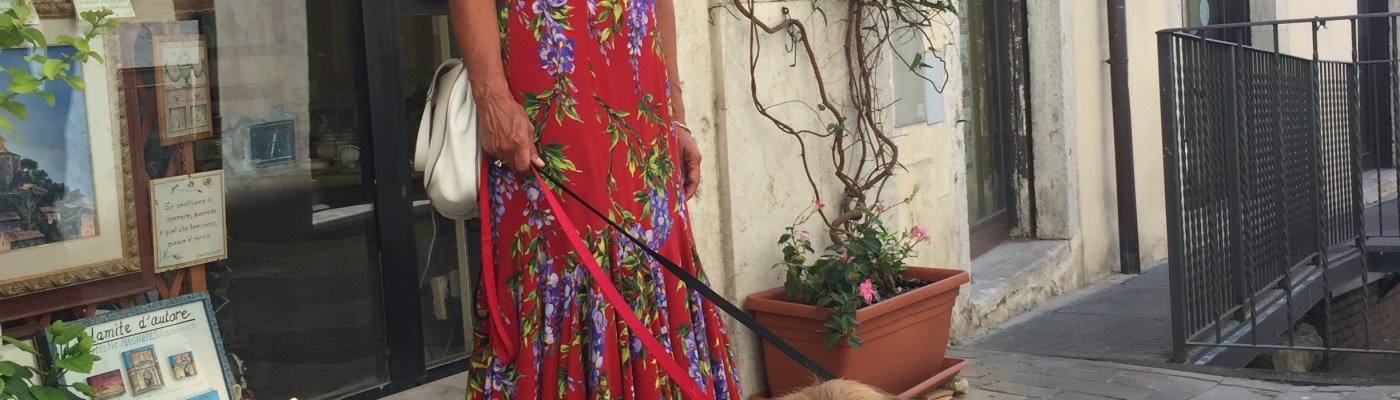 Buona domenica. Sunday morning in Amelia. Mass at chiesa San Francesco. Caffè at Pasticceria Russo. Gelato. Then caffè at the old Bar Leonardi where the barista takes My macchiato to the best table. I told you — I am only leaving for my ballet classes in LA! This red floral Dolce dress is the first I bought — at an outlet store, the 75% off rack. Love it.