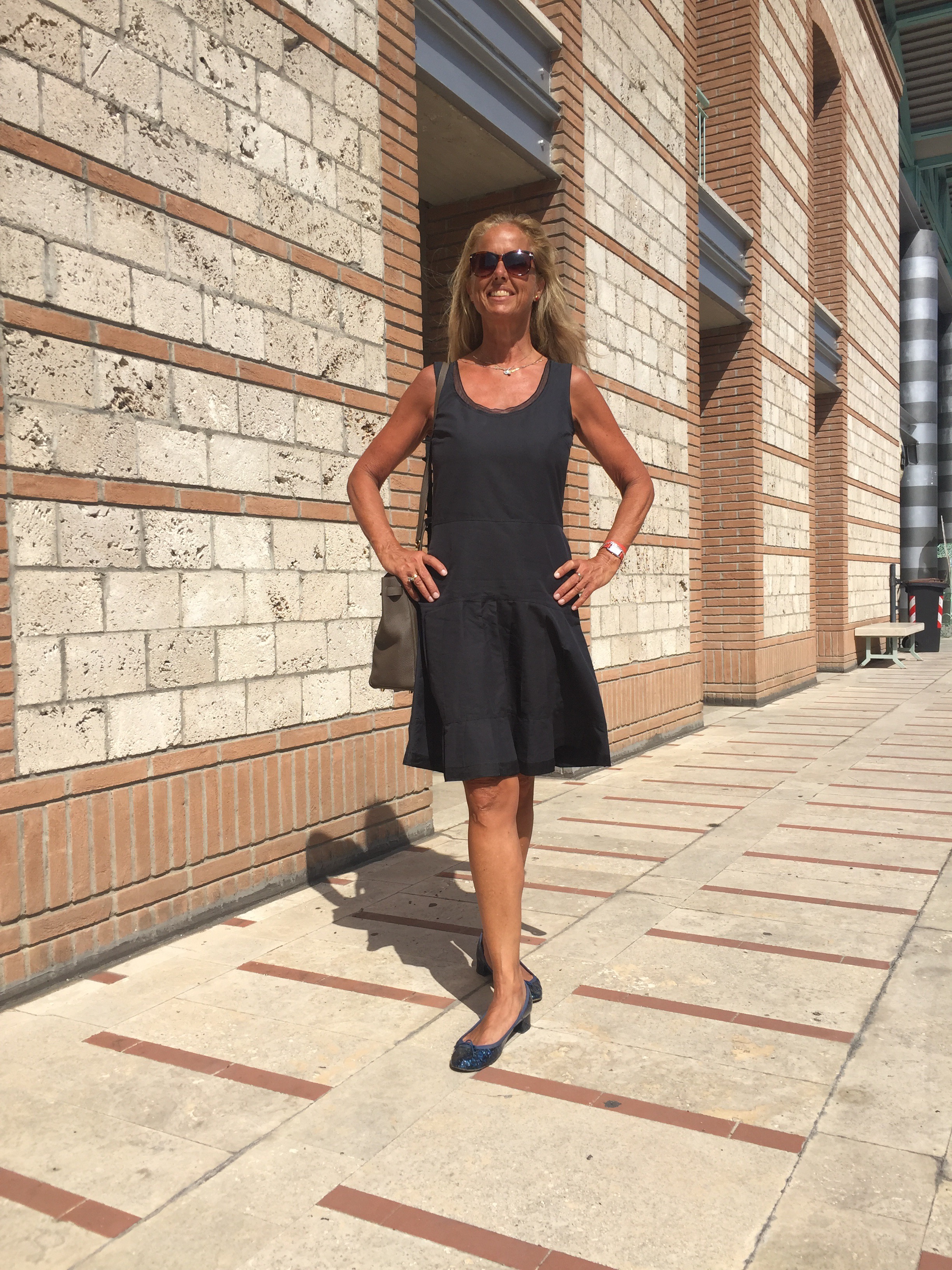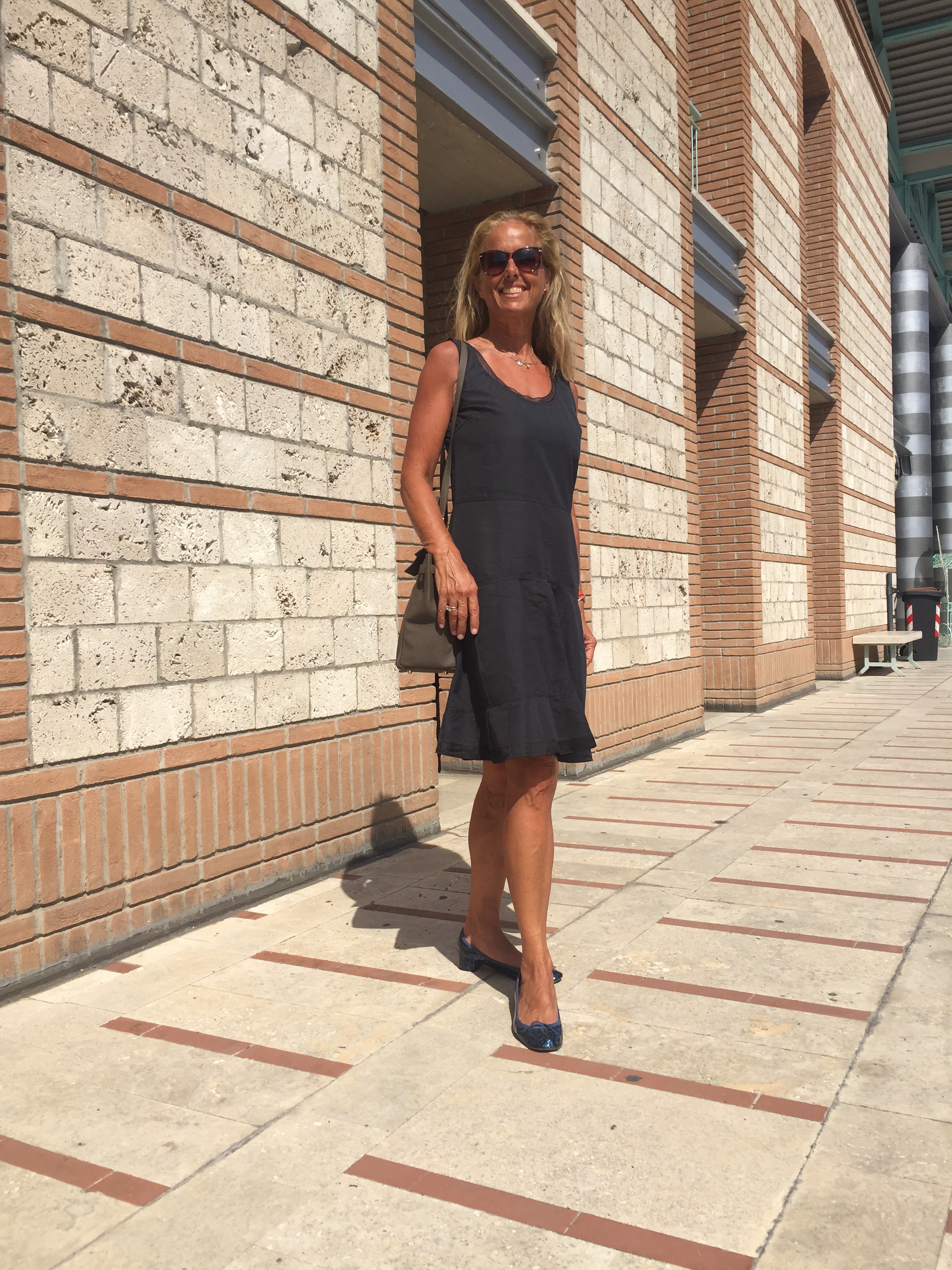 I bought this navy blue dress by Jil Sander http://www.jilsander.com at the consignment store Clothes Heaven in Pasadena, CA. The dress is a light stiff cotton, the neckline has a ruffled hem, and there are stitching details above the pleats. It is, like most perfect dresses, easy to wear and sophisticated. It can be worn anywhere and yet it is so lightweight that it can handle an Umbrian heatwave. Shoes? Repetto, certo!