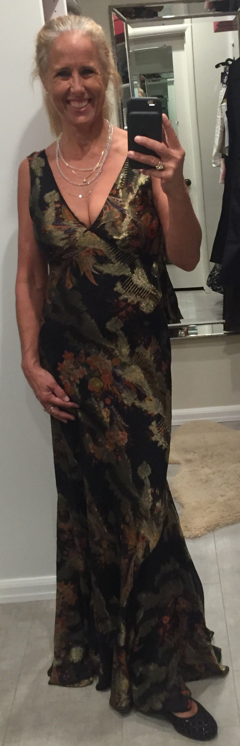 The hem on this Etro maxidress requires no hand to hold it up so it is easy to wear during the day. This sleeveless maxidress can be warm on a hot autumn day as predicted for Pasadena today and I can skip the nylons, wearing it here with chunky heel Chanel boots. I bought both the Etro maxidress and the Chanel pumps at a 75% discount from Neiman Marcus — one of my favorite places to shop because a purchase depends on finding the right size — and one of my American Express credit cards rewards me with gift cards to use at NM. I have had both the Etro dress and the Chanel pumps in my closet for a long time and they remain some of my best purchases for style, quality, and because ai can find so many reasons to wear them. Later today I can slip on a leather jacket and this dress becomes more versatile — and I can kick off the pumps for boots! I use fashion to create a happy disposition so that I can be productive — hope it works for you too!