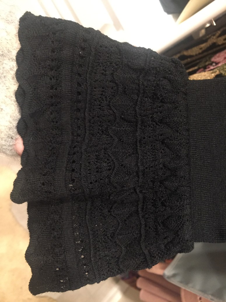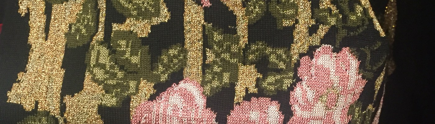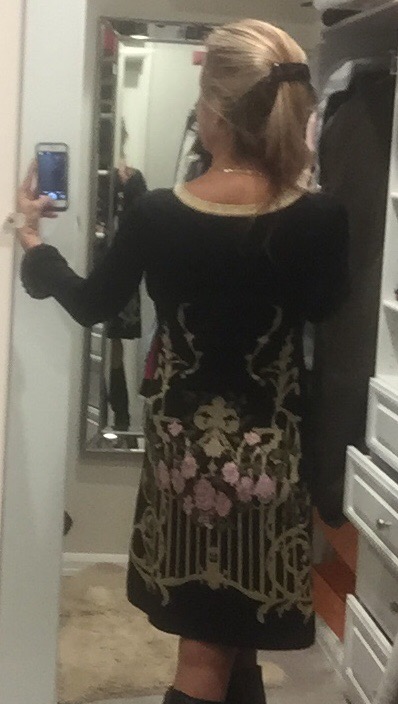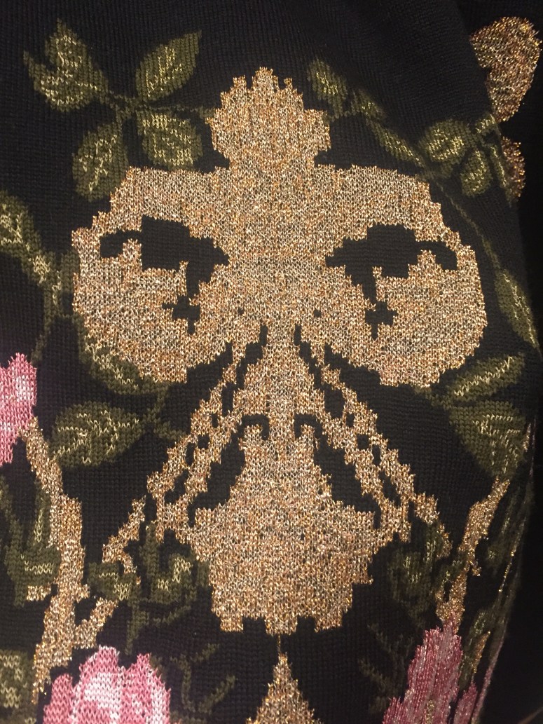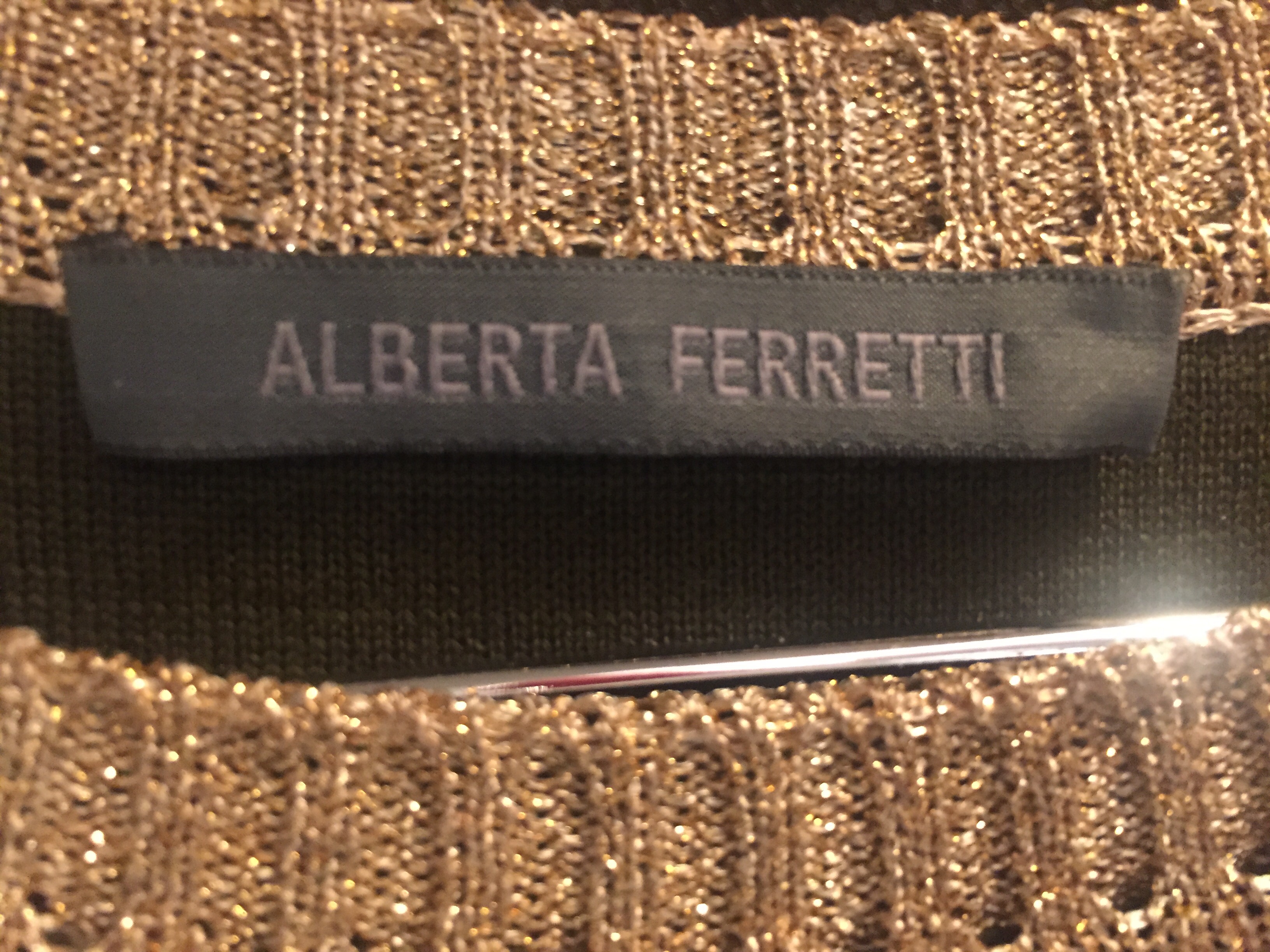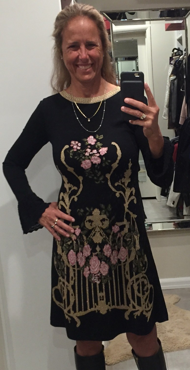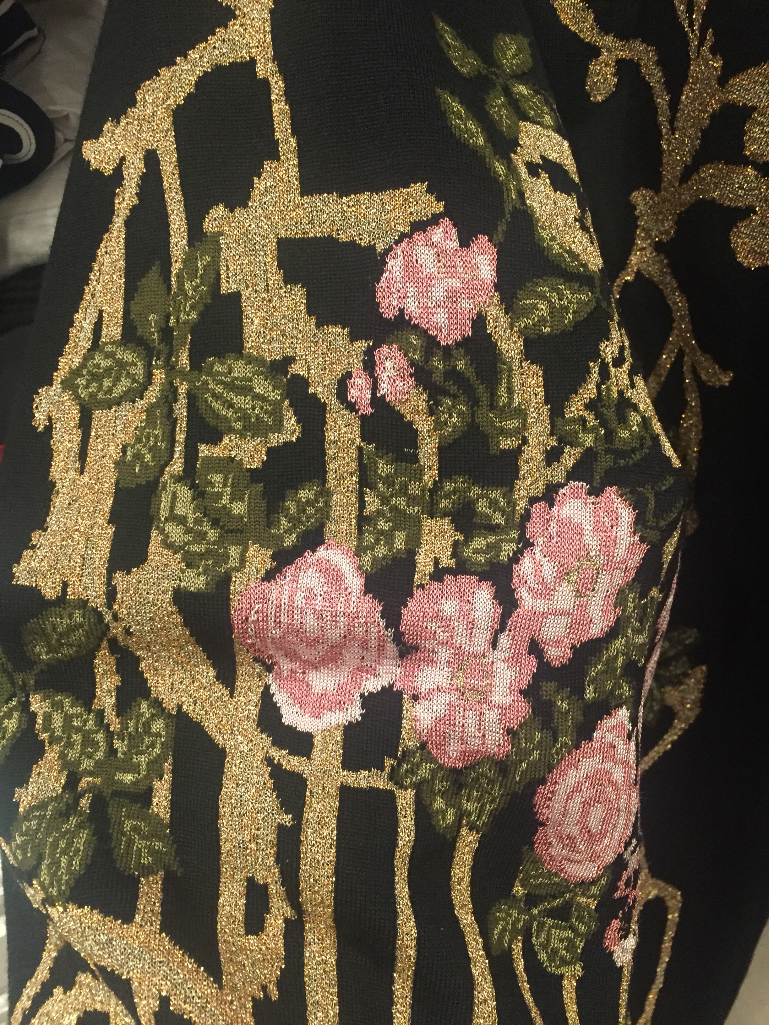 I’m in love with Alberta Ferretti — the materials are pretty and elegant, the materials light and luxurious. Here this long sleeve black dress trimmed in gold with a pink and gold floral motif is simple, elegant and versatile. I wore this dress this morning and found myself entranced by the knitted lace sleeves around the wrists. Sigh — a good reason to shop the summer sales in Rome!