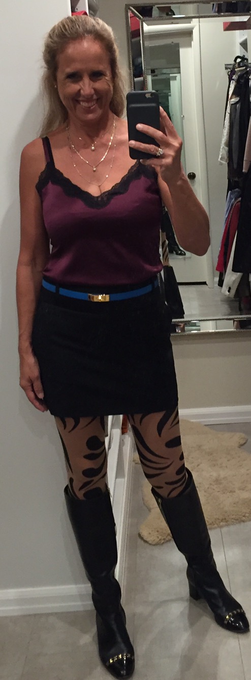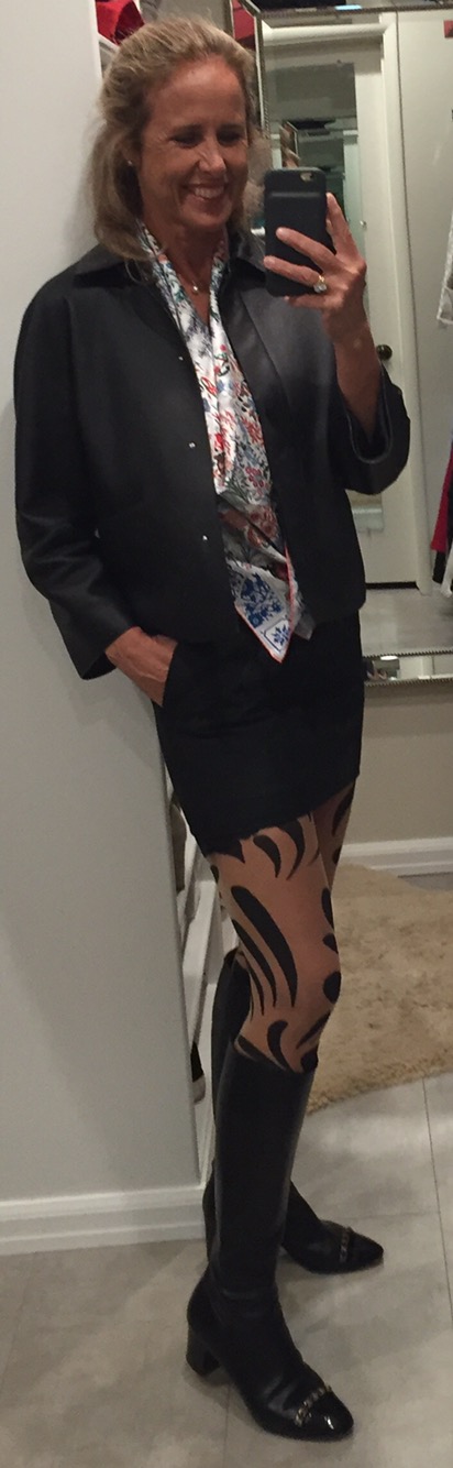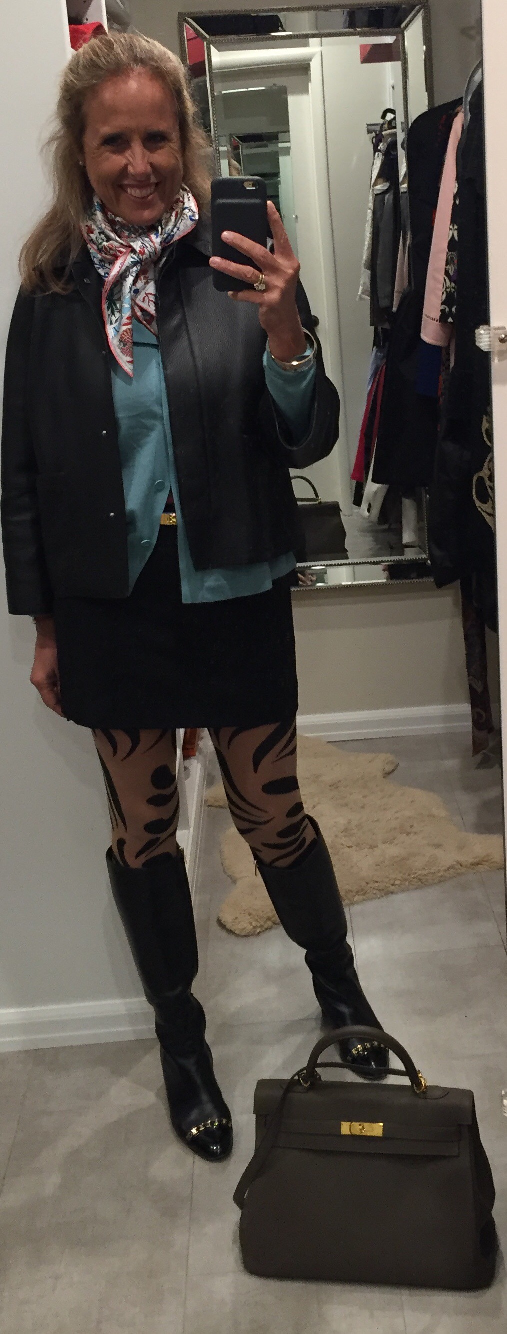 The last few photos show how I got comfortable with these tights, exchanged the long skirt and big belt for a wool miniskirt and small belt, added a silk slip, and a cardigan and leather jacket — and a scarf!