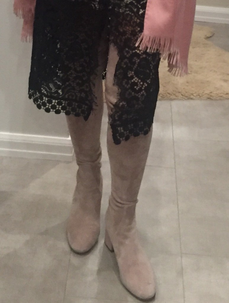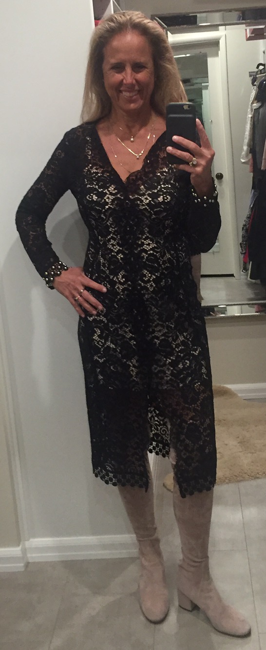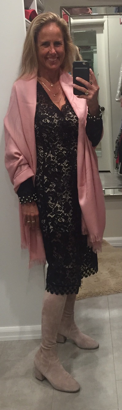 Meanwhile, today started with those irrisistible pink suede Valentino boots, the Pinko black lace and pink slip long sleeve dress with the front slip, and a comfortable pashmina by Hermès. Wear your best clothes — you’re living for today.