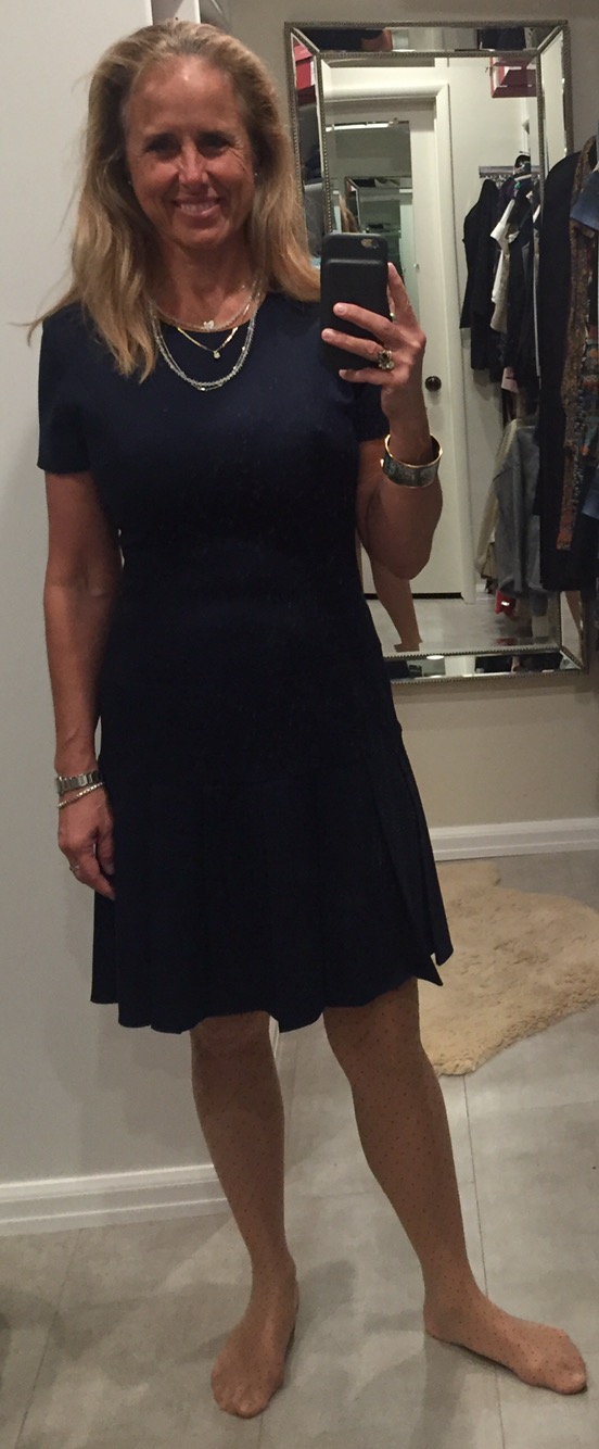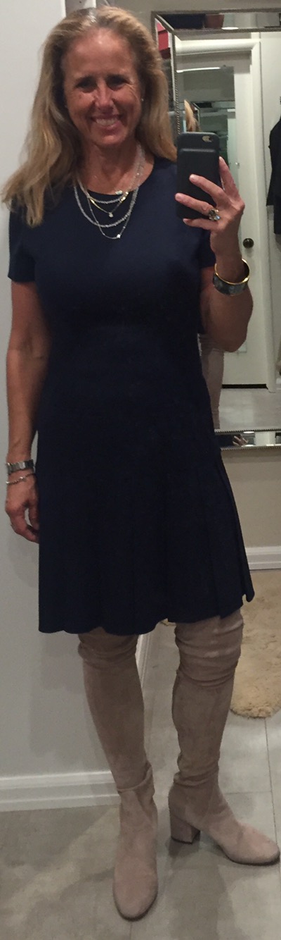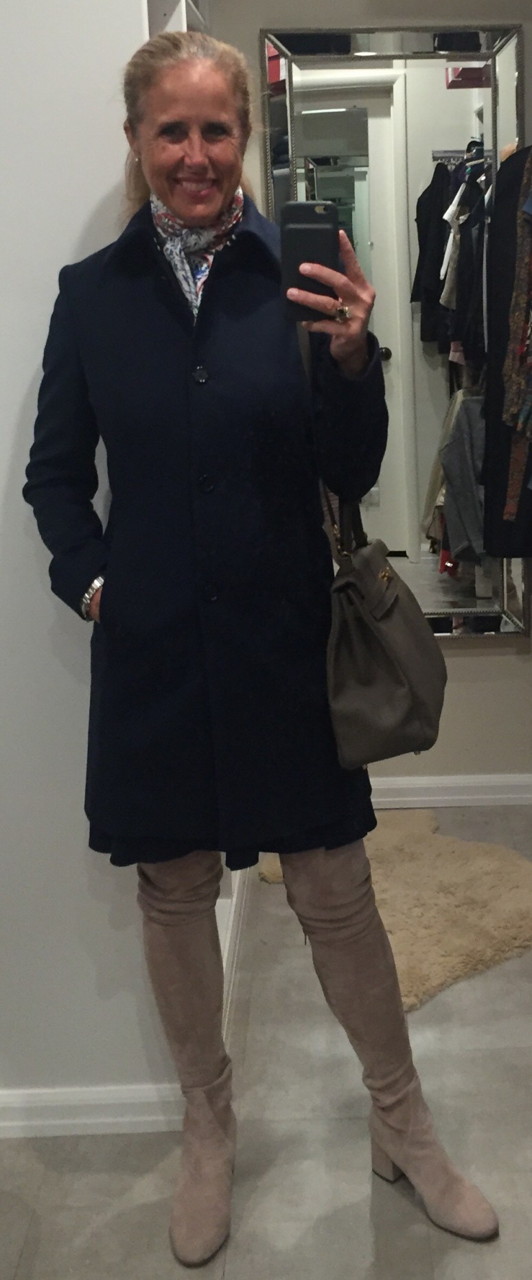 Matched two-year-old Hugo Boss Navy wool dress and coat with pink suede over-the-knee boots to create energy, fun, and bonding. Yesterday I wore my pink suede over-the-knee boots to the bank. The teller loved the boots and she and I talked about clothes while we conducted the transaction. A little female bonding, a few laughs. I bought the Hugo Boss outfit on sale in Rome a few years ago on a great shopping trip with my Partner-in-Fashion from a team of female saleswomen who were so skilled that they sold two coats in August to me — a woman who lives in sunny Southern California!