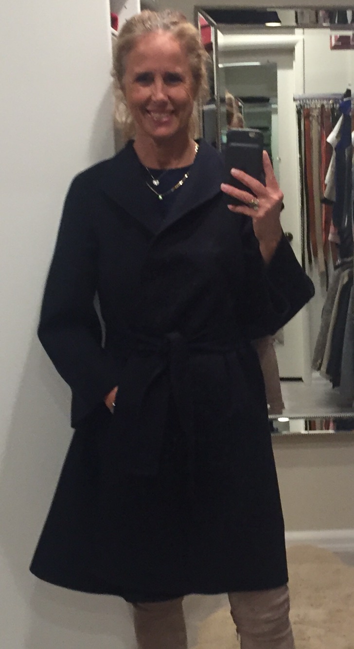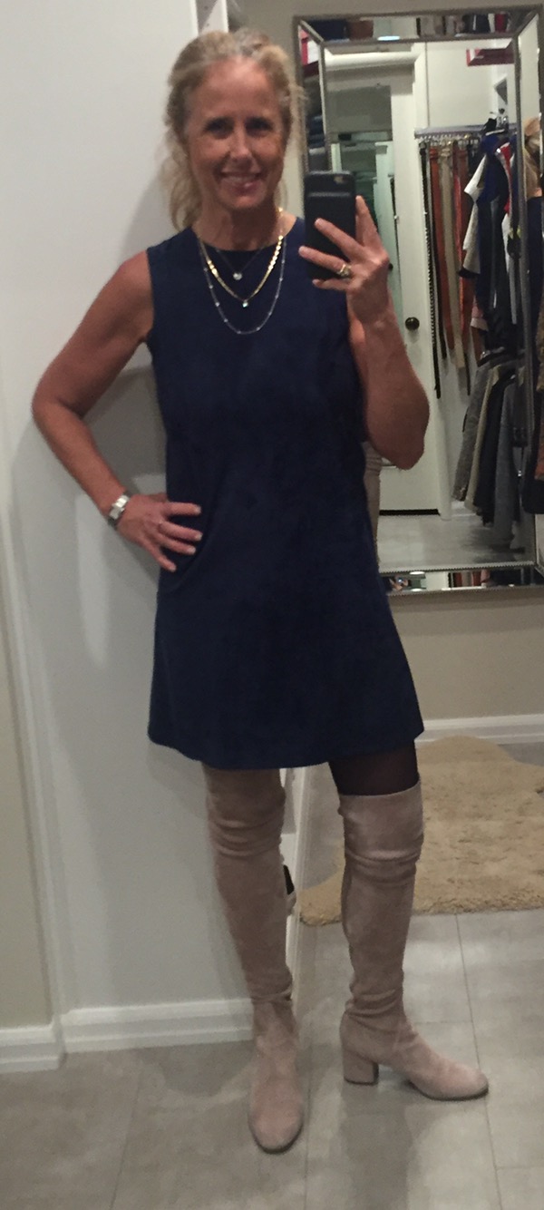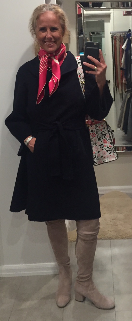 Fall in love with comfort and quality. Pink suede over-the-knee boots found last May/June at the Neiman Marcus sale (my favorite for shoes!). Blue suede Balenciaga dress my Partner-in-all-things-Fashion (Claudia) Found shopping the Balenciaga outlet store in Cabazon two years ago. The cashmere-wool blue Escada coat from last spring’S sale at the Beverly Hills store. The bright pink striped Hermès scarf? Purchased in Paris many years ago at a sale that requires hours of standing in line. And the Prada handbag with the many zipped compartments? Allegedly imperfect and purchased at the brand’s out-of-the-way outlet store in Tuscany. Buy quality offseason and on sale at a discount and plan to keep forever!