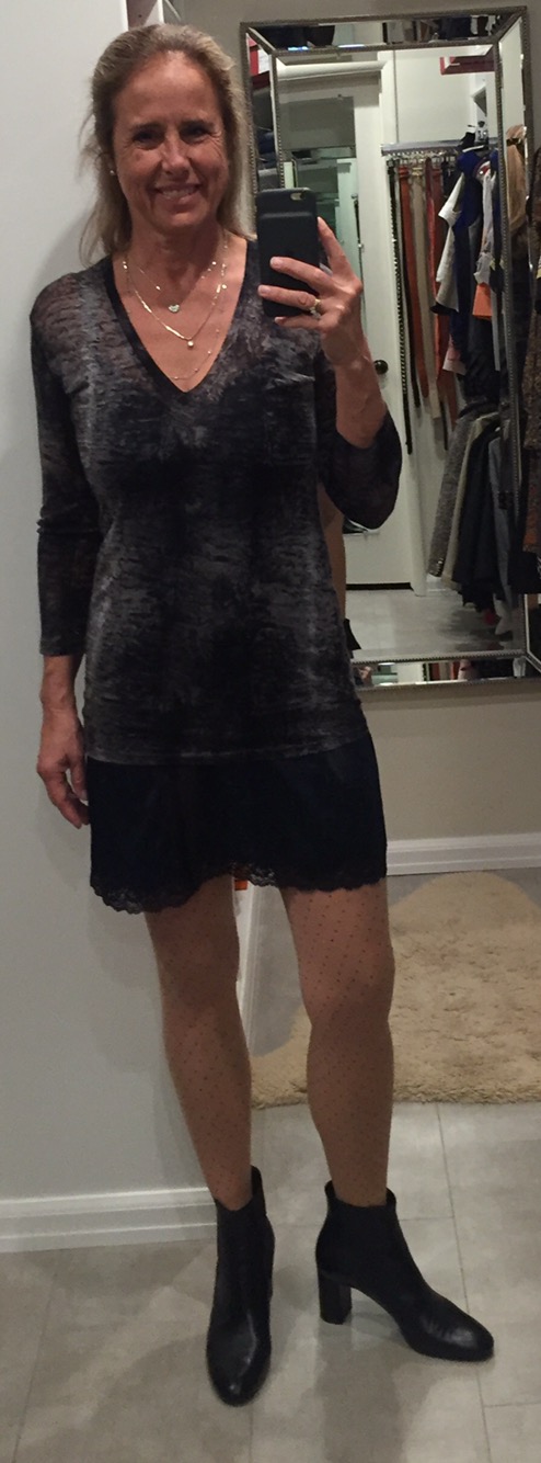 Autumn. Lace slips. Wolford tights. Saint Laurent ankle boots. Bottega Venetta block heels. Add suede skirt and long sleeve v-neck sheer T-shirt by Samantha Sung (available at Pearls in San Marino). Voila!