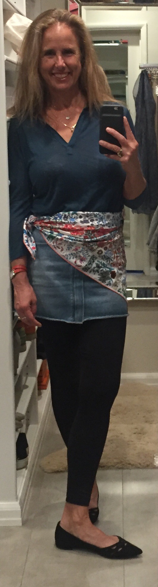 James Perse acquamarine shirt. Joie denim miniskirt. Anne Fontaine tights. Prada black flats. Tie everything together with a fliral scarf — this one is by Hermes.