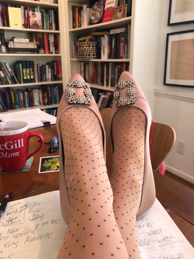 February 5, 2018February 5, 2018 by Playing_dressup_after_55 Manolo Blahnik nude satin flats entertain on the writing desk Excellent foot support — glamor and beauty — likely helps with putting down words on a blank page. Share this: Click to share on X (Opens in new window) X Click to share on Facebook (Opens in new window) Facebook Like Loading... Related