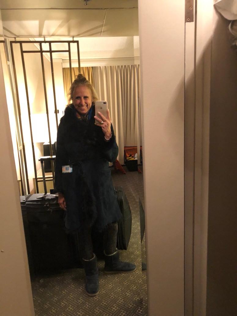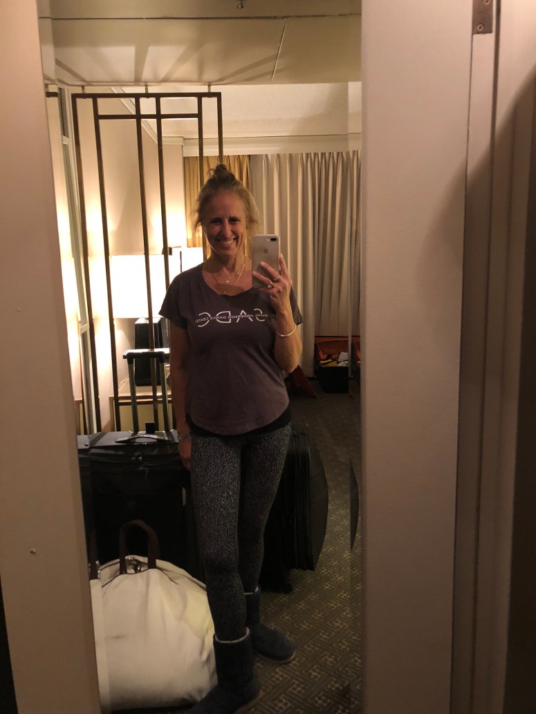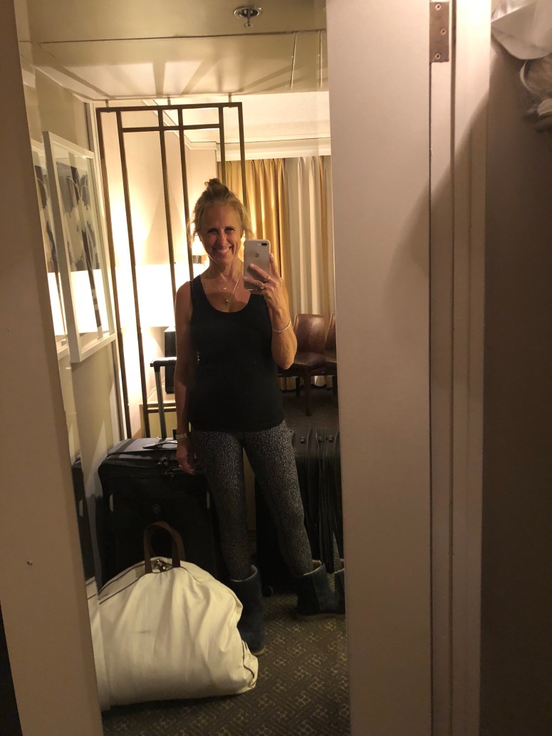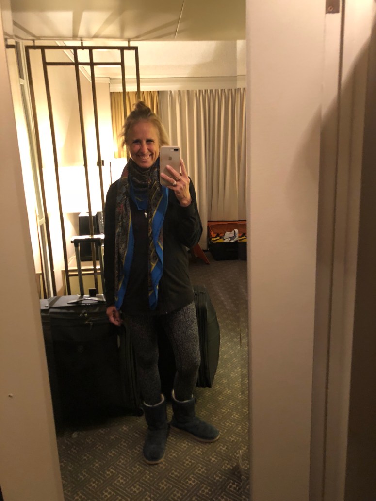 Lululemon align pants, Ugg boots, Majestic Filature camisole and tank, a dance tshirt and light cotton jacket under a bulky warm coat with a pashmina scarf! A coat pocket big enough to fit a paperback book is very convenient!