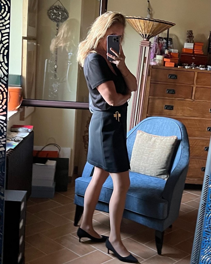 Black shirt, black skirt, black shoes and handbag. Basic uniform. This skirt is a synthetic and wearable year-round. Simple black skirt can be worn weekly!