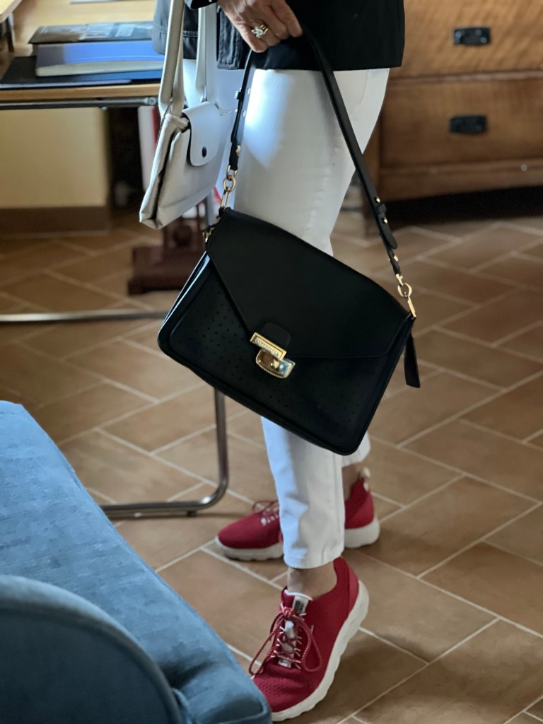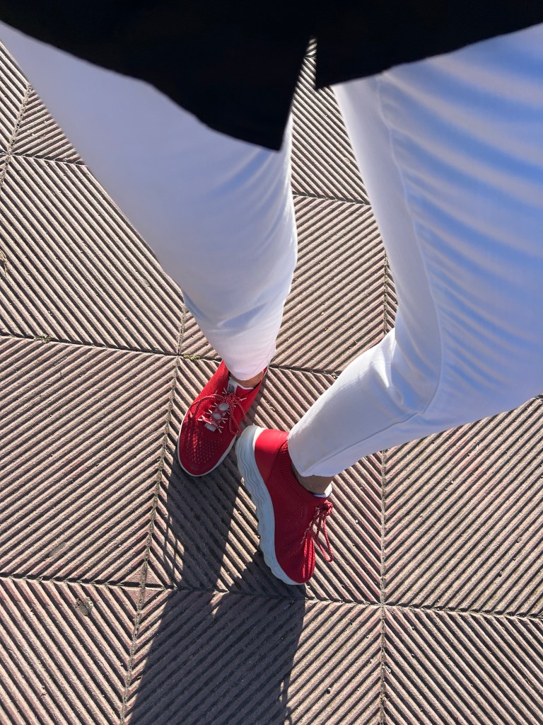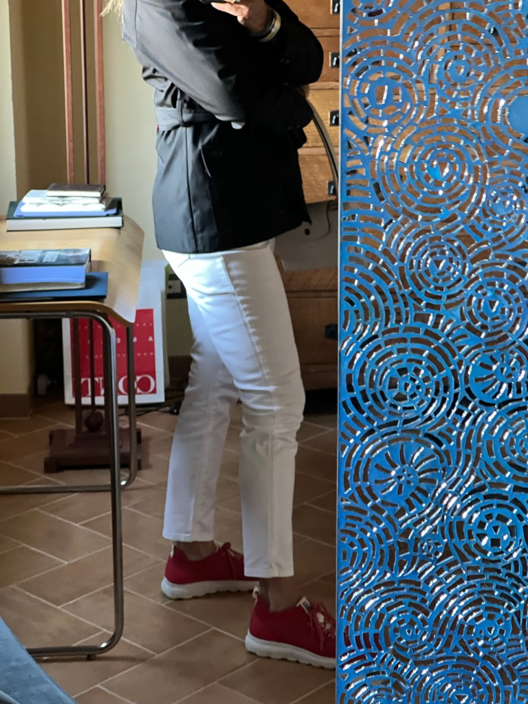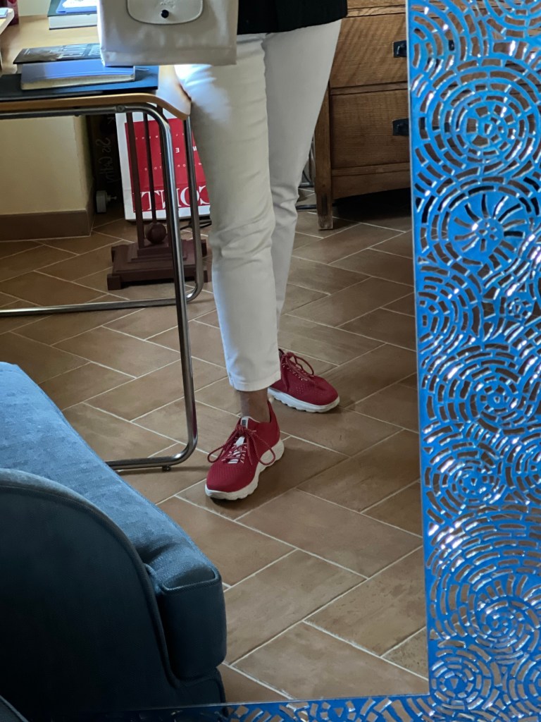 Going into Rome, where pavement is a mosaic of cobblestones requires practical shoes. I loath practical when it comes to fashion. But after many mistakes, I am resigned to what style and what color Geox. I chose red canvas with white jeans and a black and white knit sleeveless top with ruffles.