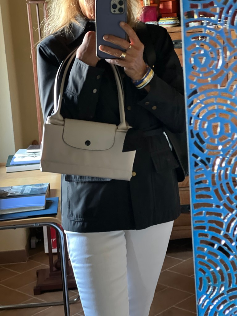 Mid-May the weather is hot, or at least it was yesterday and forecast for today. This belted and structured windbreaker will later be folded into the Longchamp long handled tote which carries my hat, sunglasses, and nuts.