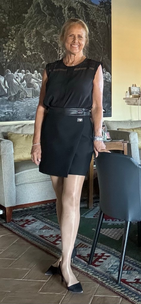 In my search for inspiring work attire for my newly employed daughter, I found this black wool skirt with a built-in leather belt. Then, because it’s summer, lightened the will with a nearly sheer black blouse purchased in Paris two decades ago. A search through shoe boxes revealed a rarely worn pair of black kitten heels which are strangely discreet and comfortable. So easy to fall into a black clothes routine!!