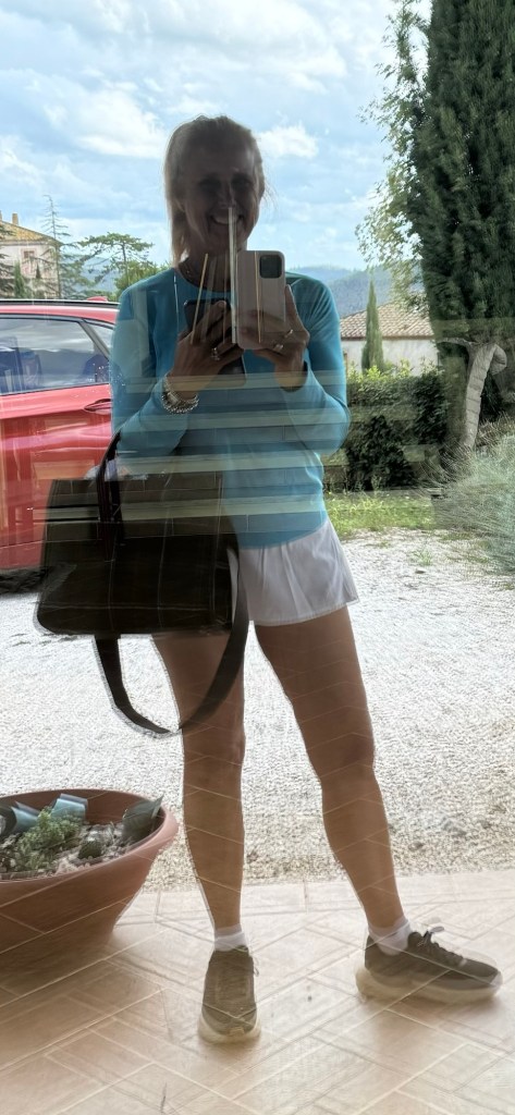For tennis, I wear the vivid colored of Lululemon in skirt, shirts, and even the shoes which already have the red tint of our clay courts in Umbria.