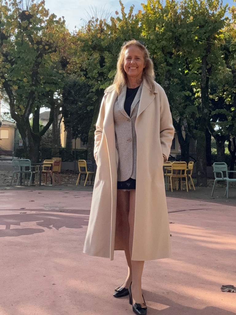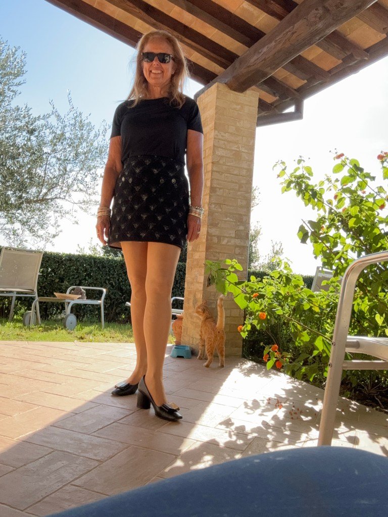 Even the best autumn days in Amelia enjoy warmth in the sun, then cold in the shade. Changes out a leather jacket for a big blazer and a coat before stripping down to black t-shirt and skirt.