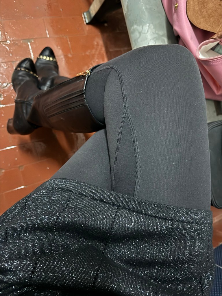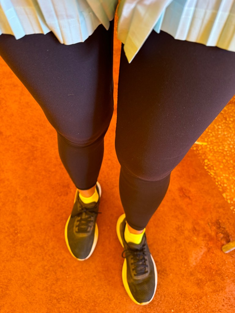 Still in the warm glow of winning a fun tennis match, I had a relaxing shower at the club, then discovered I hadn’t brought tights for the next outfit. But the Lululemon Align pants substituted for Wolford tights. It’s all about surviving the transitions.