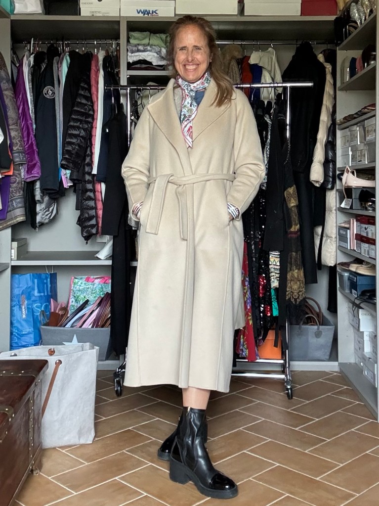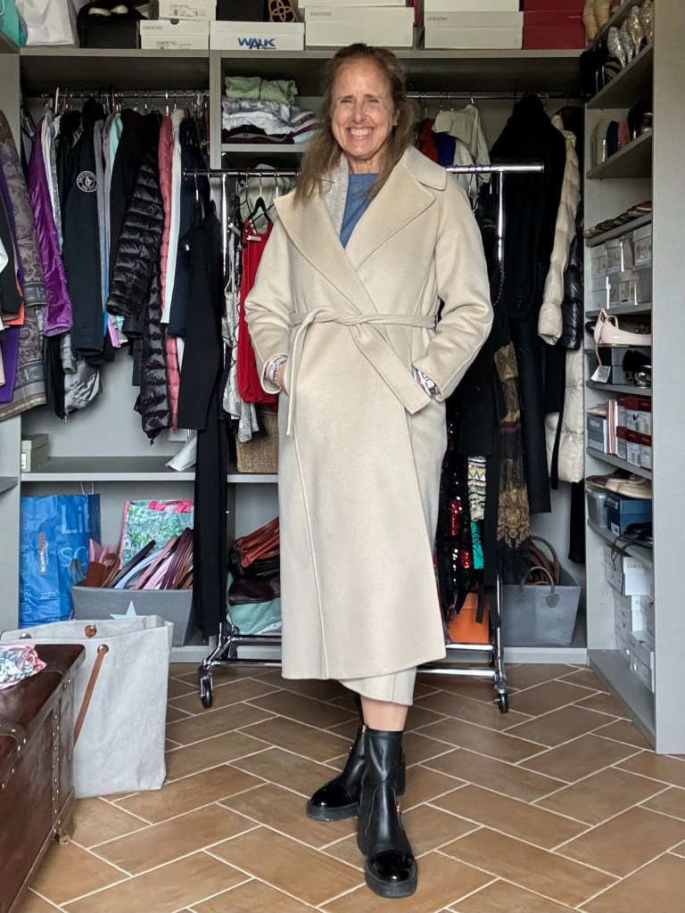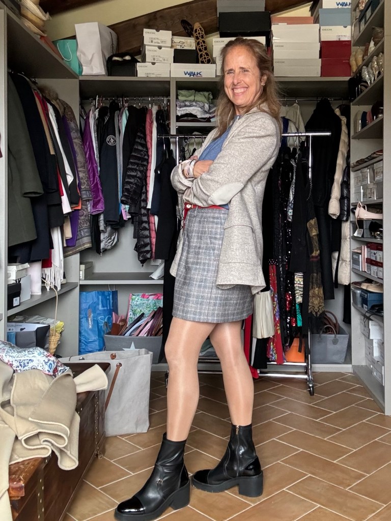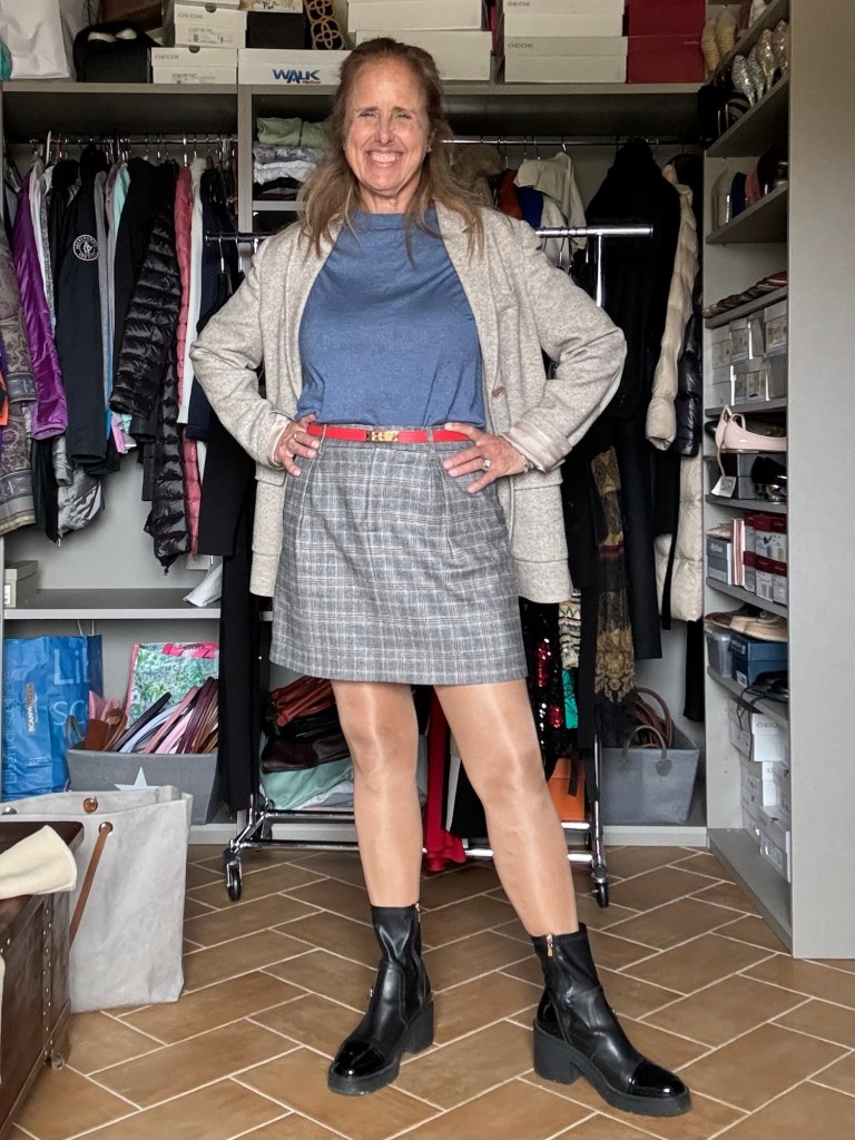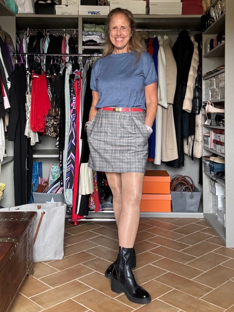 Red belt, blue sweater, and a plaid skirt add color to autumn clothing: