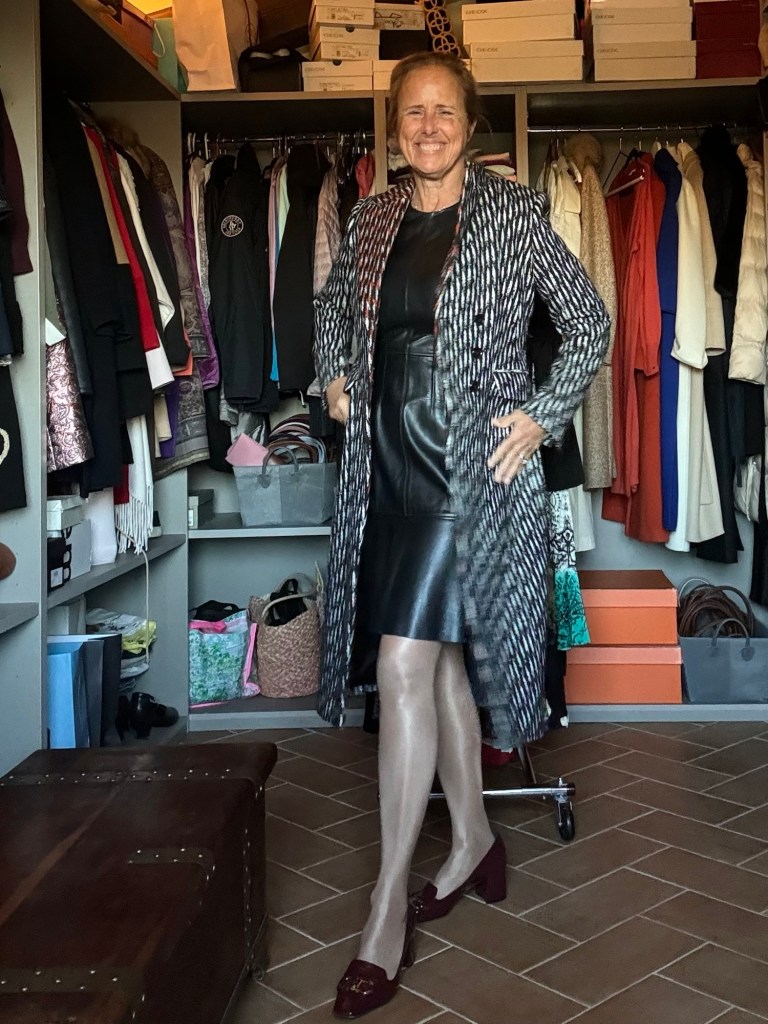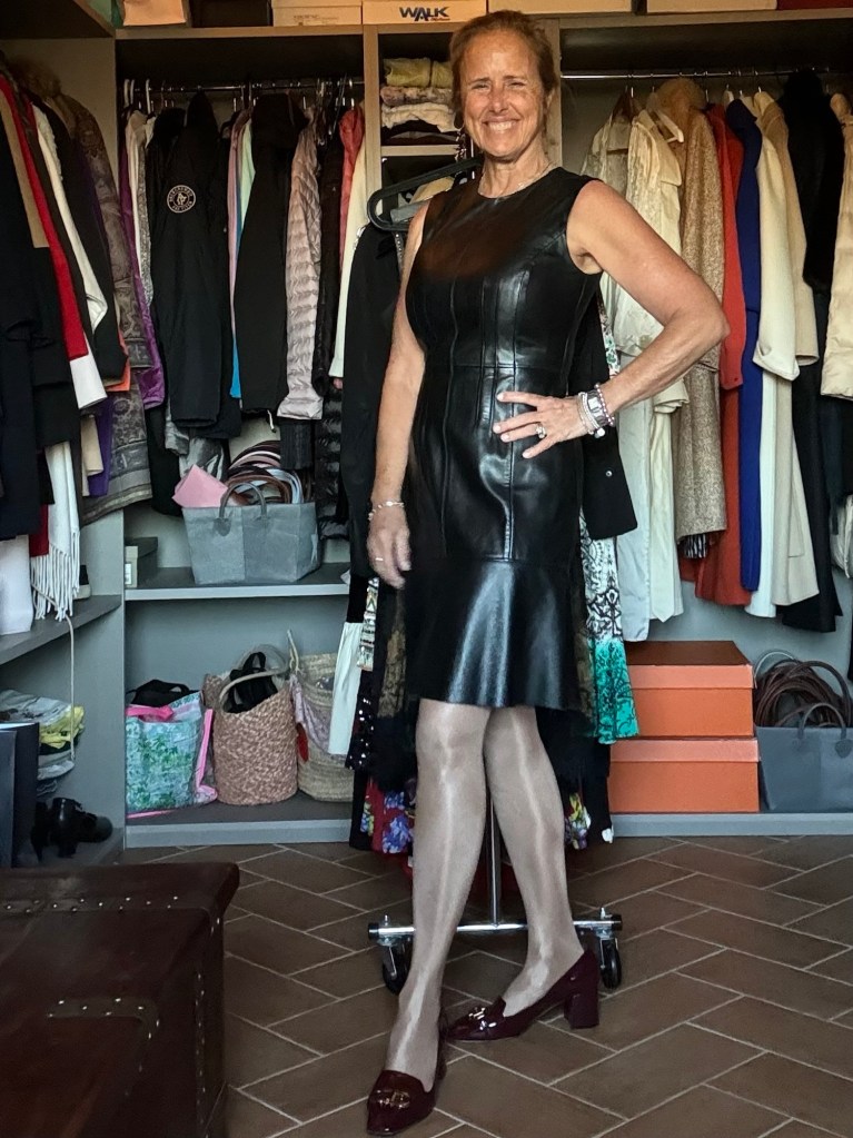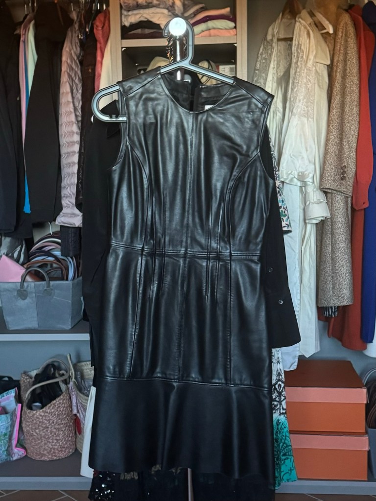 Leather dresses are fairly easy to wear — there is some flexibility in the material. This is a Hugo Boss dress purchased 5-8 years ago. An important factor is can a piece still be worn as the body changes, either with muscle or a healthy weight gain. This dress still works.