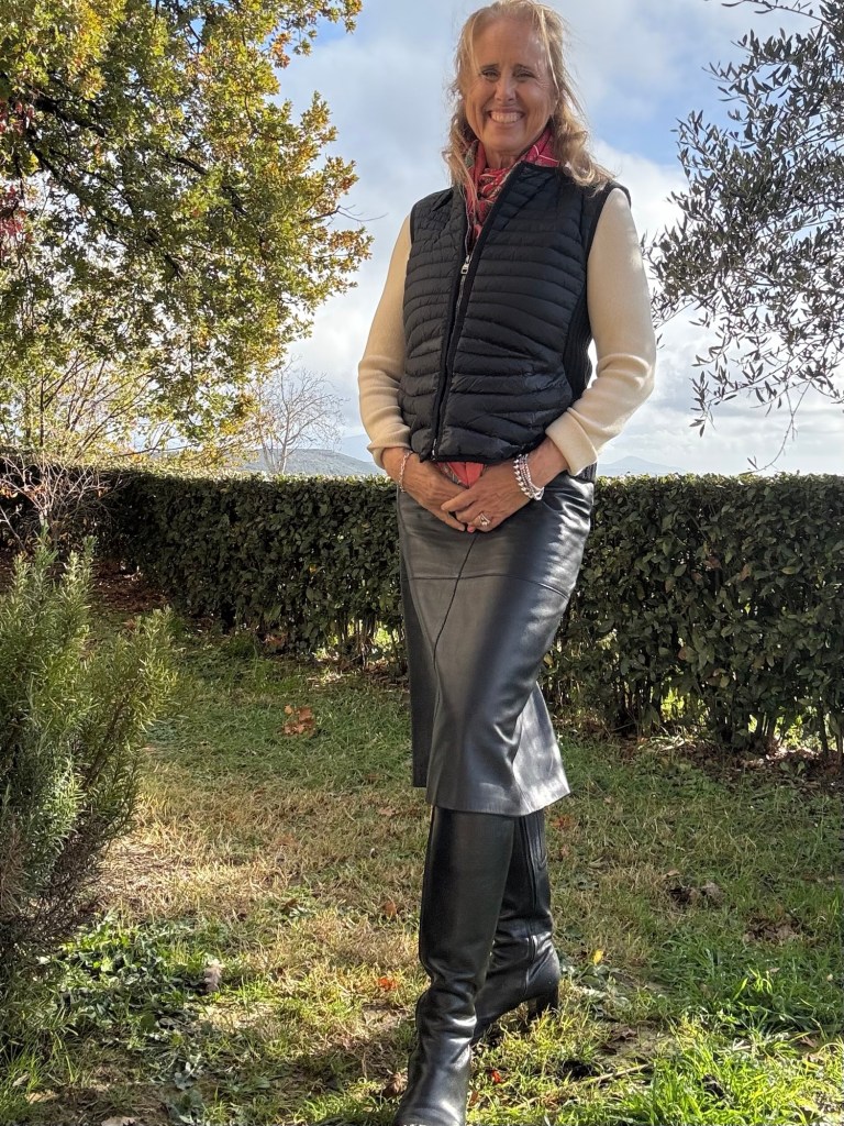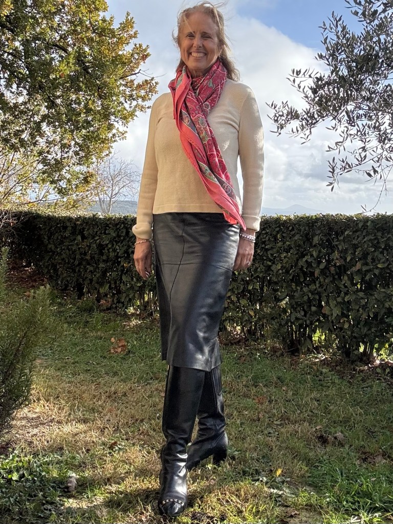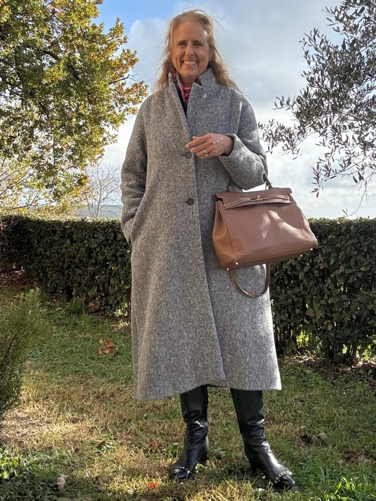 Silk camisole and cashmere tights are the foundation to seal in body heat. A cream-colored baby cashmere sweater is very warm. Then add a cashmere and silk pashmina for the neck, a down-vest for the chest, and a long grey coat of baby alpaca and wool (this one has deep pockets which hold gloves, keys and cell phone in place). These ballet pink cashmere-lined leather gloves reminded me of how much I love color with grey. What do you wear when you would rather stay inside on a cold Sunday morning?