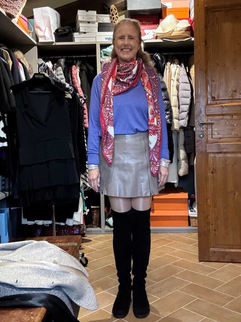 I have my favorites, and they are worn often. But other items in my seasonal closet get ignored. Today’s self-challenge in fashion was to wear a pair of over-the-knee flat-heeled boots, an older model Ferragamo handbag, and a purple cashmere sweater rarely worn. What have you overlooked in your closet?